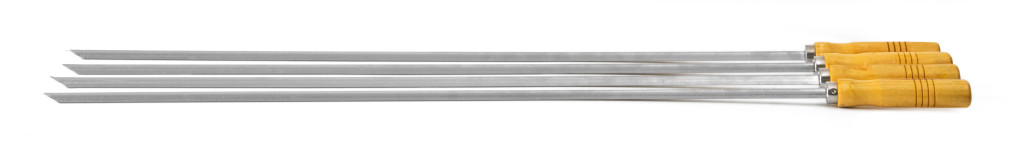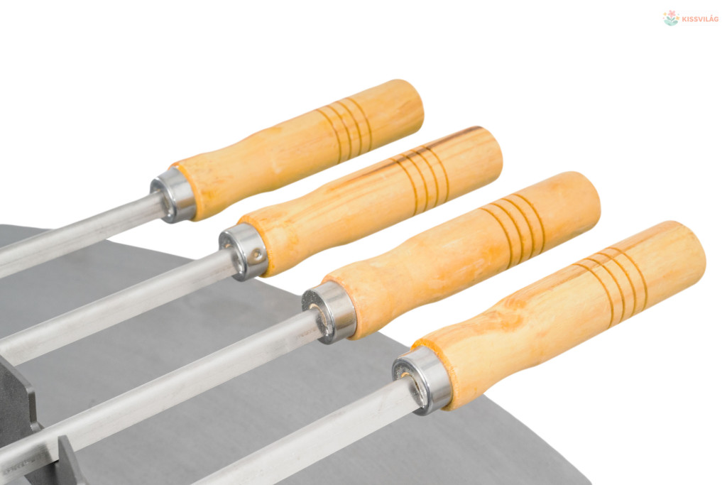 4 db rozsdamentes acél grillnyárs készlet tölgyfa nyéllel. Tű hossza összesen 86 cm, amelyből a nyél 13 cm-es.