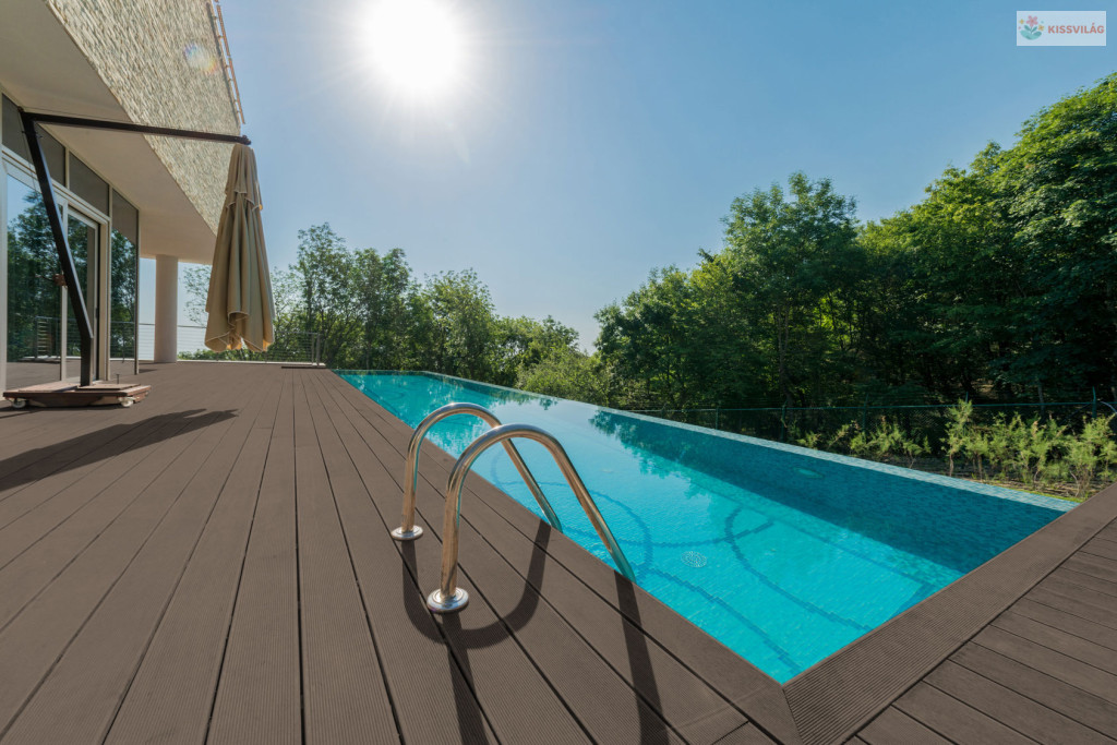 A WPC padlóburkolat végtelen medence körül a háznál