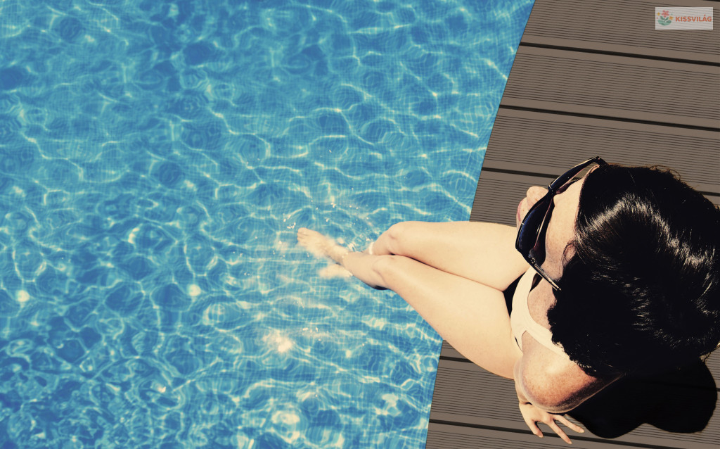 Egy nő a WPC terasz padlóburkolaton ülve medence mellett
