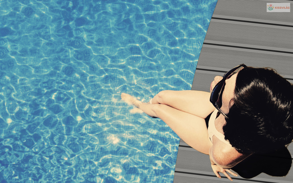 Egy nő a WPC terasz padlóburkolaton ülve medence mellett