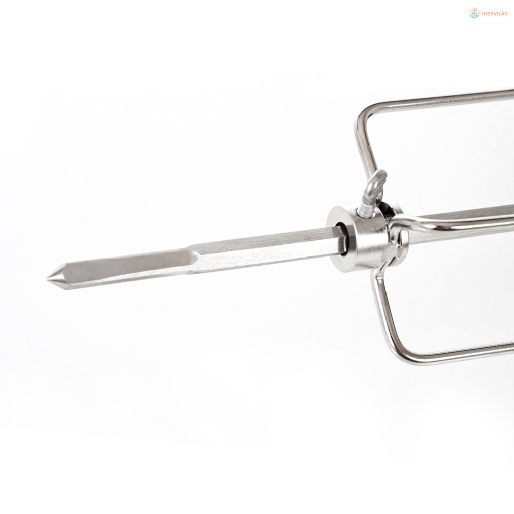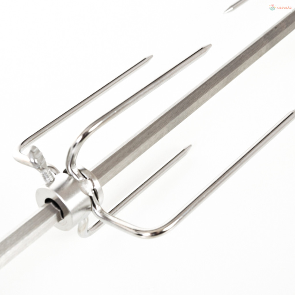 A motoros grillnyárs rozsdamentes acélból készül és mindkét oldalán négy tűvel van ellátva, rögzítő csavarokkal kiegészítve, amelyeknek köszönhetően a tűket saját igényei szerint állíthatja be.
