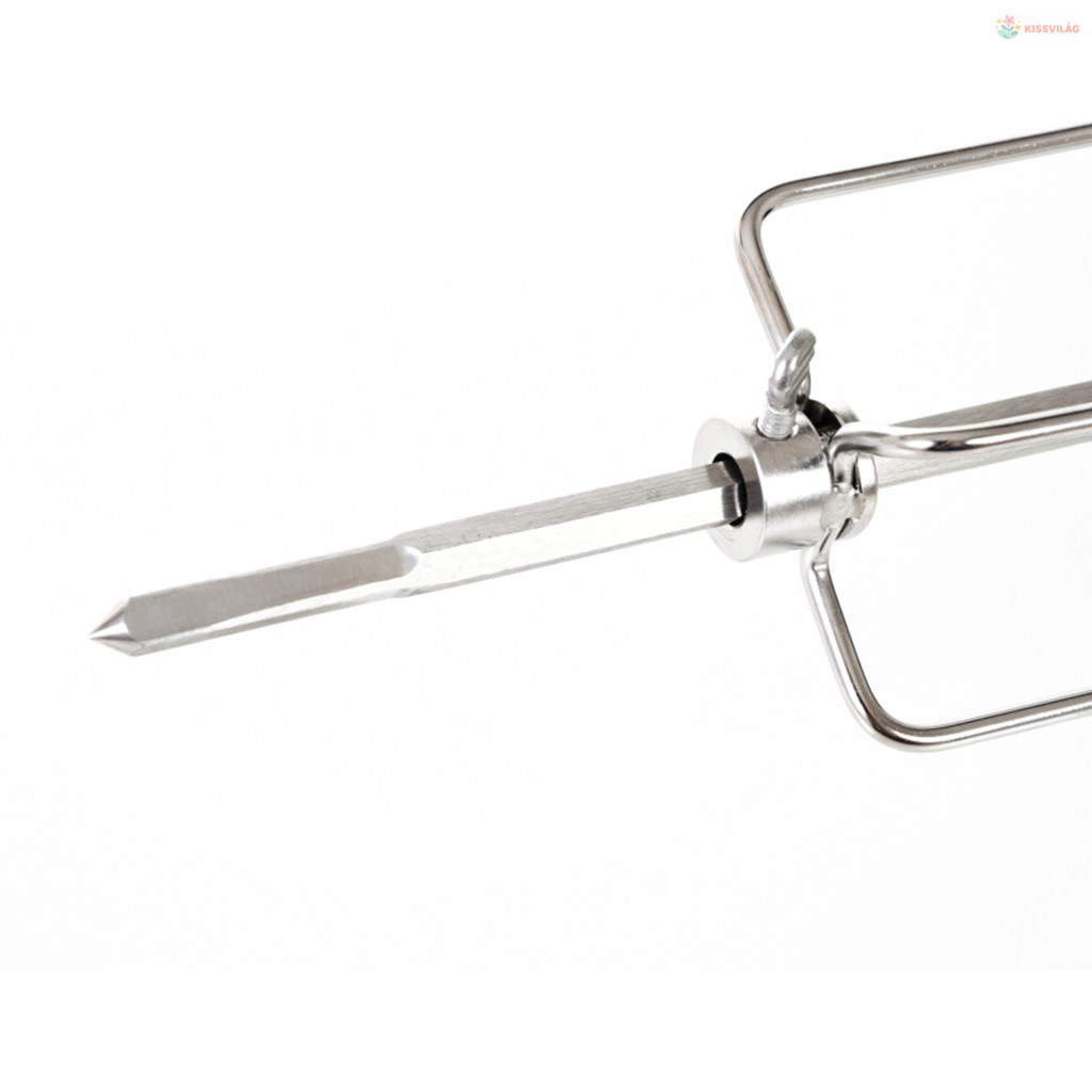 A motoros grillnyárs rozsdamentes acélból készül és mindkét oldalán négy tűvel van ellátva, rögzítő csavarokkal kiegészítve, amelyeknek köszönhetően a tűket saját igényei szerint állíthatja be.