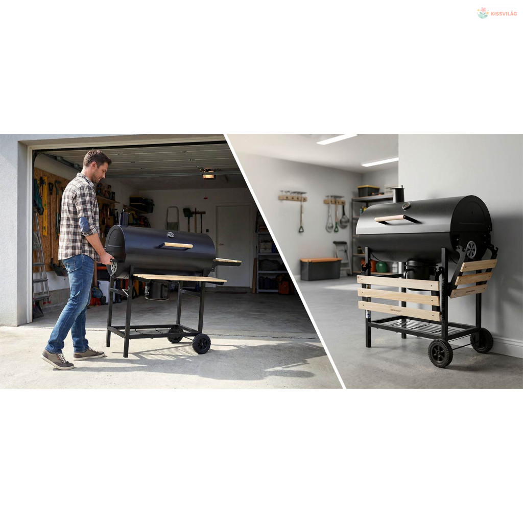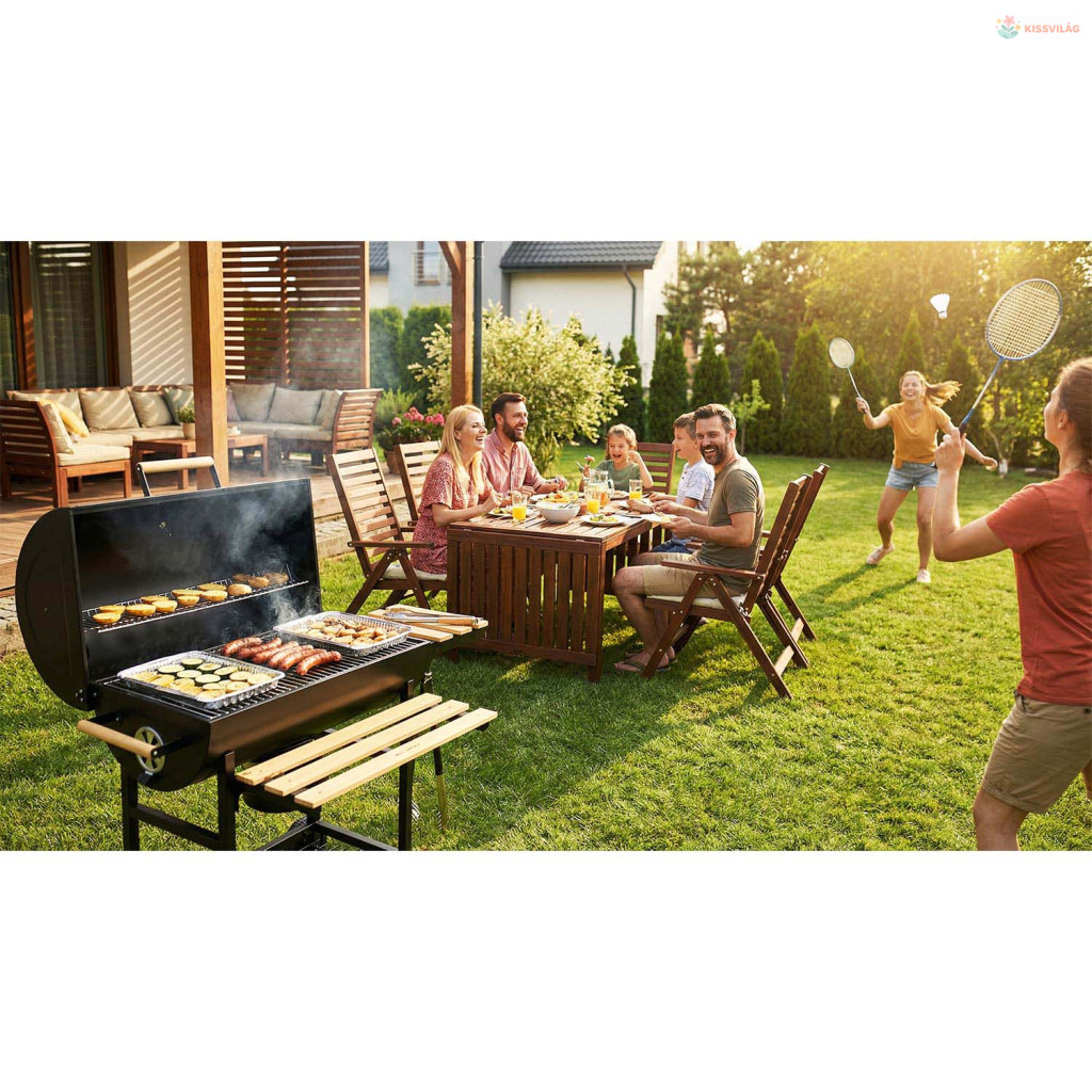 Berdsen kerti hordó grill kéménnyel, polcokkal és hőmérővel – fekete