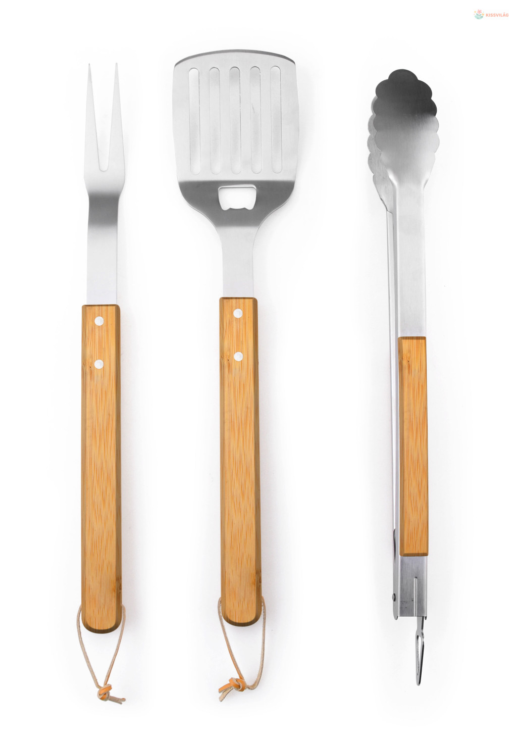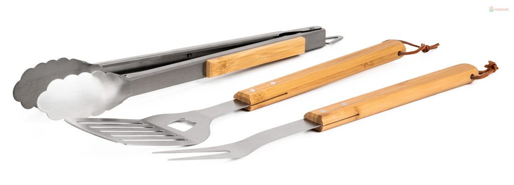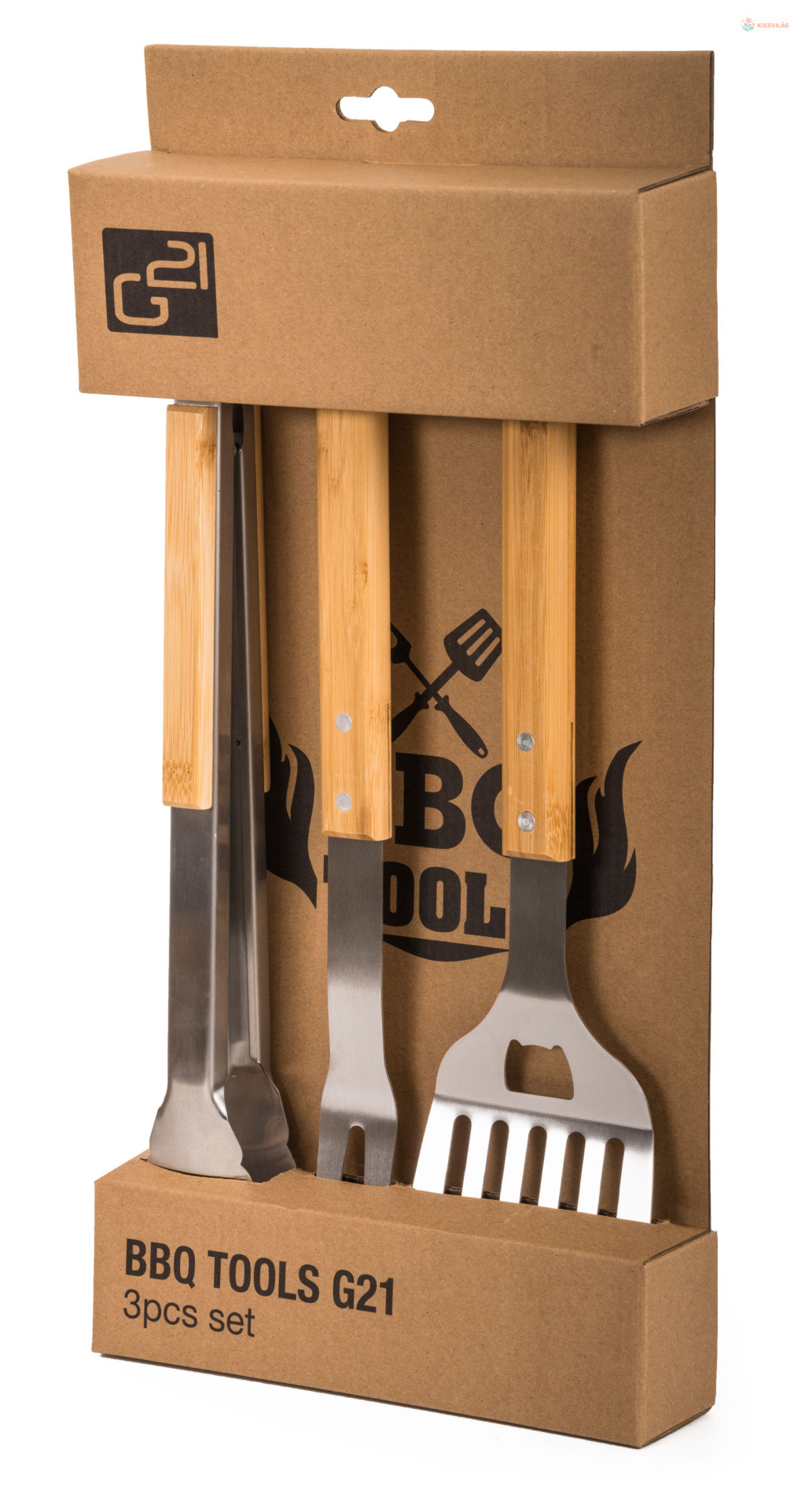 A G21 grillsütő készlet 3 darab grillezőeszközt tartalmaz. A készlet tartalmaz egy villát, egy grillező fogót és egy forgót. Minden szerszám nyele bambuszfából készült.