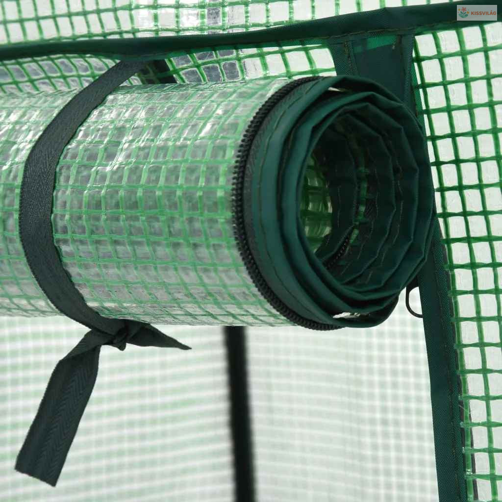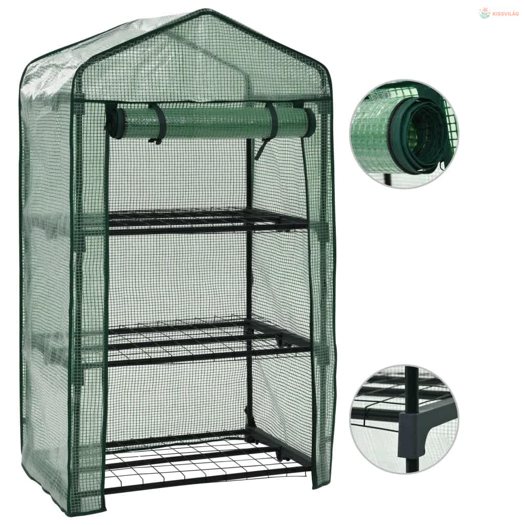 Szerkezete a fokozott stabilitás érdekében tartós és rozsdaálló acélcsövekből áll. A külső burkolat polietilénből készült, ami összegyűjti a hőt, és megóvja a törékeny növényeket a rossz időjárástól és a rovaroktól. Feltekerhető cipzáras ajtaja könnyű hozzáférést és szellőzést biztosít. Három polcán rendezetten helyezheti el a cserepes növényeket, a palántákat és az egyéb kertészeti eszközöket.
