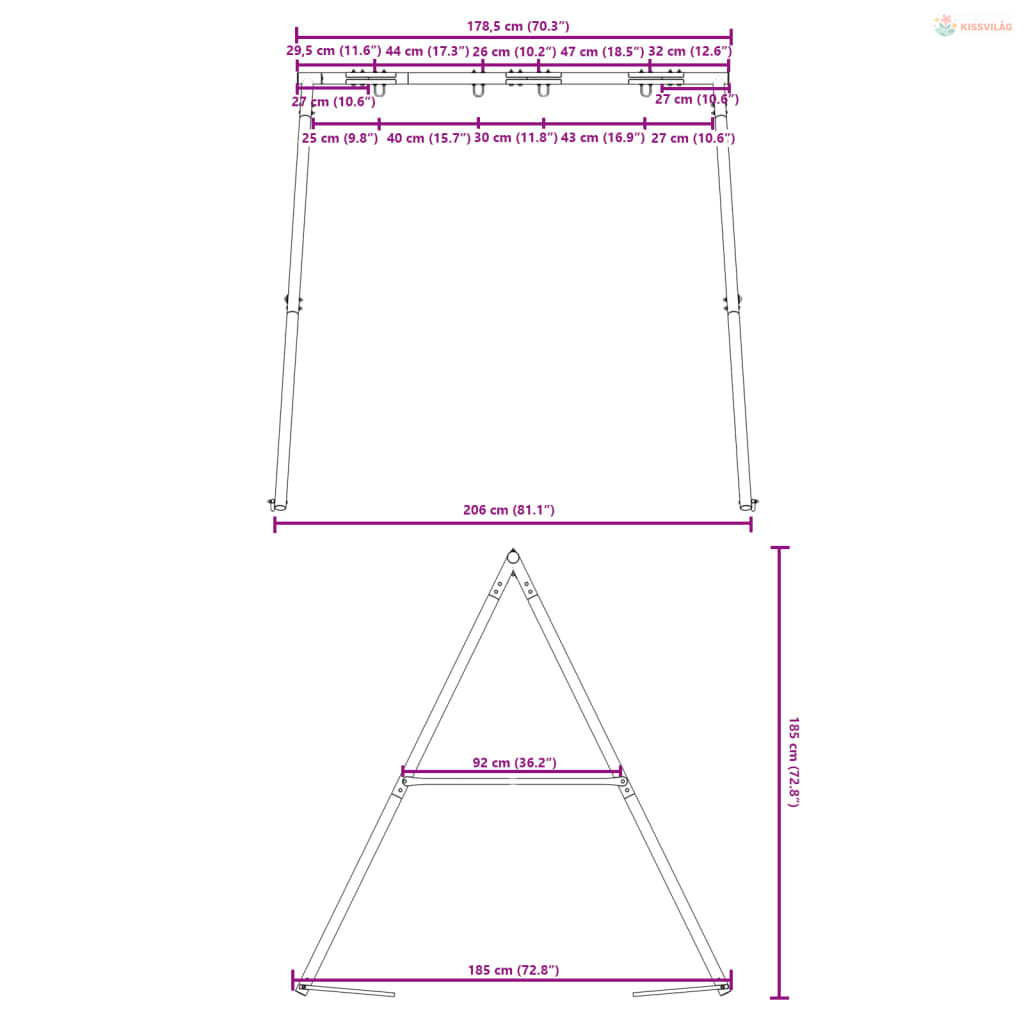• Szilárd és stabil szerkezet: Ez a hintaváz A-alakú kerettel rendelkezik, amely erős támaszt biztosít, billenés nélkül. A megerősített csavarkötés jelentősen megerősíti az általános szerkezetet. Ezenkívül négy további cövek növeli a stabilitást és a biztonságot.