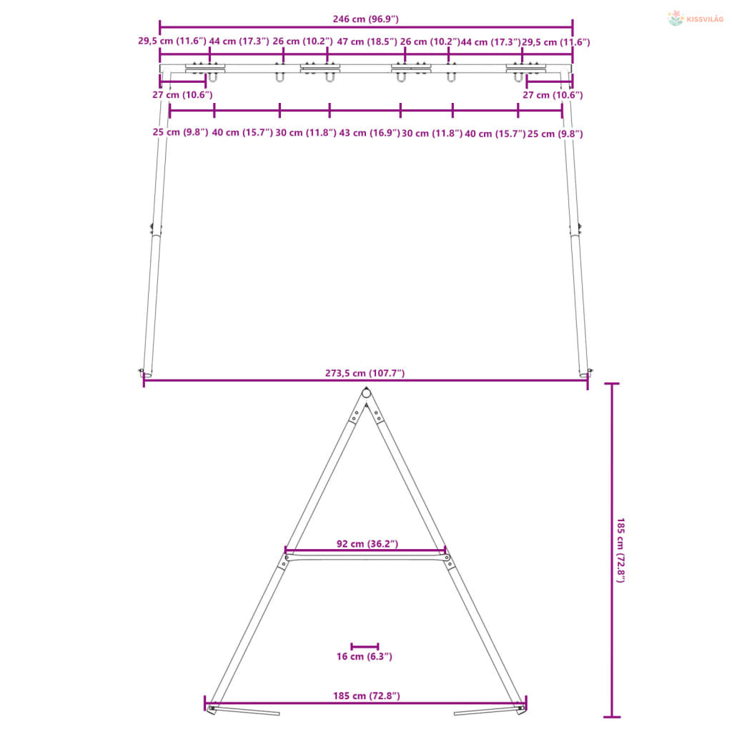 • Nagy teherbírású fém anyag: Ez a hintaváz festett acélcsövekből készült, amelyek rozsdaállók, rendkívül erősek, és ellenállnak a deformációnak, kiváló stabilitást és tartósságot biztosítva.