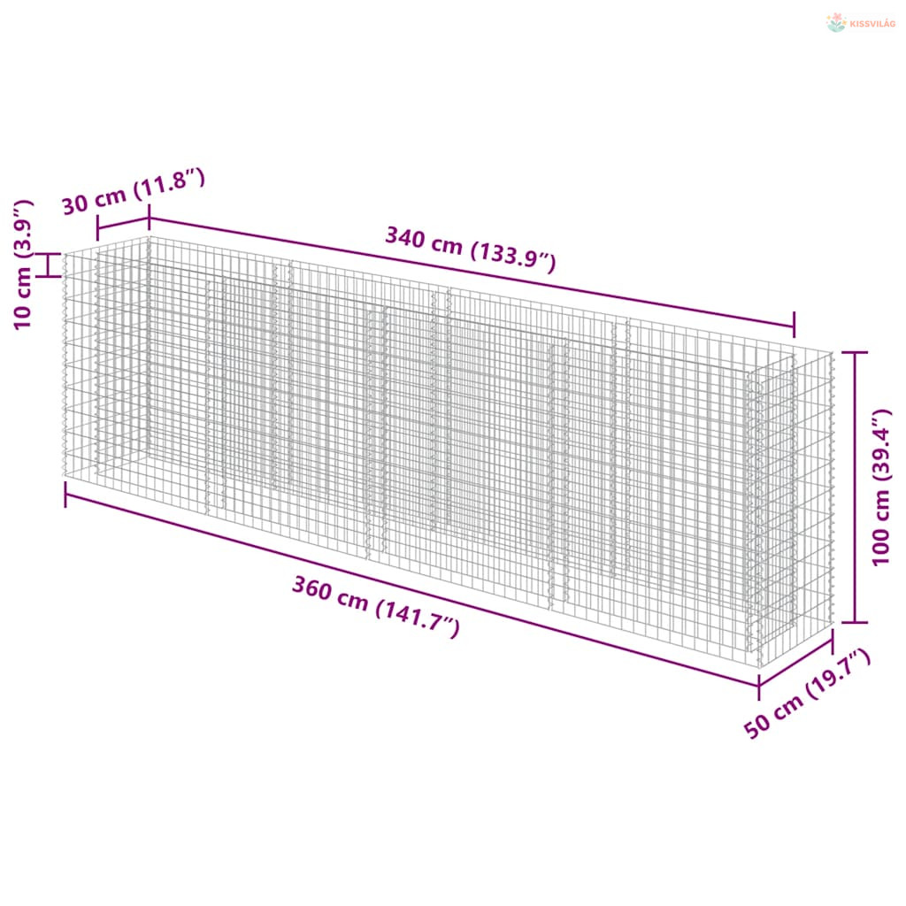 Horganyzott acél gabion magaságyás 360 x 50 x 100 cm