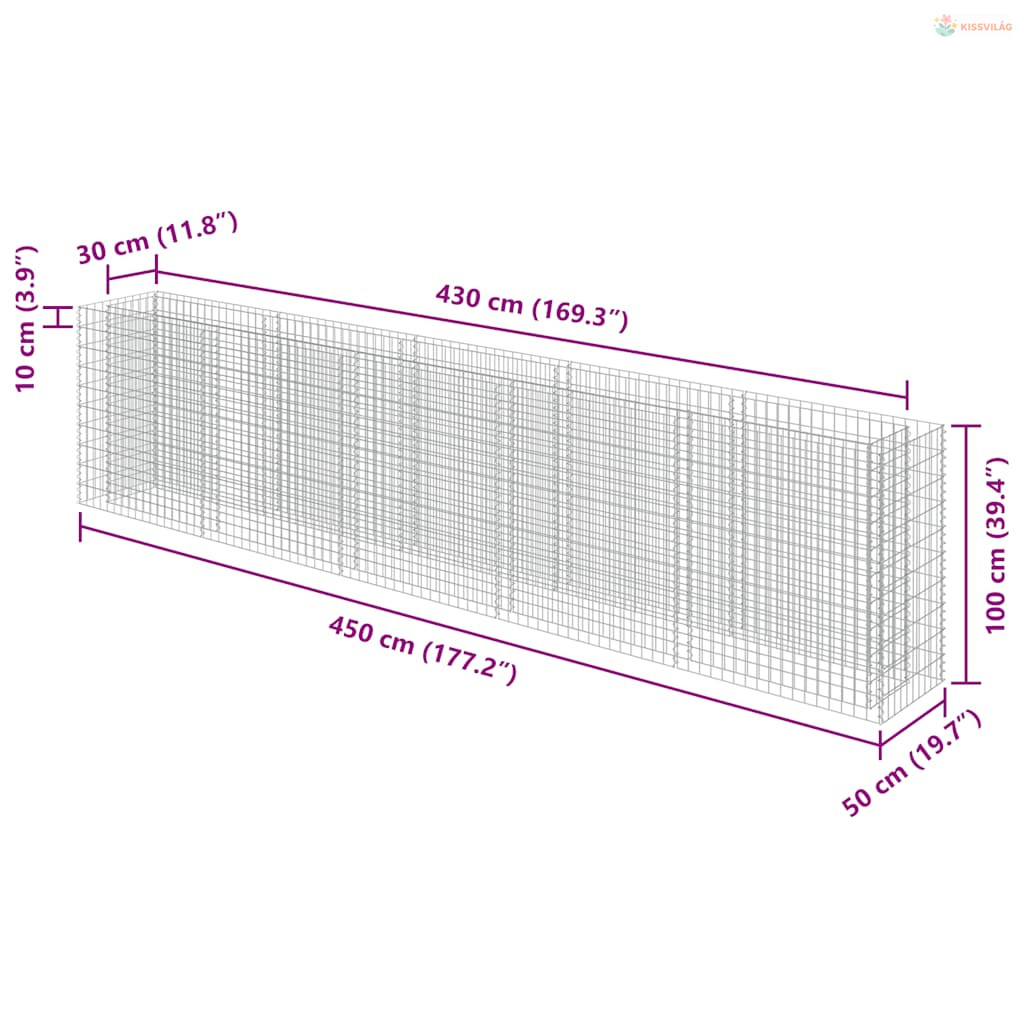 Horganyzott acél gabion magaságyás 450 x 50 x 100 cm