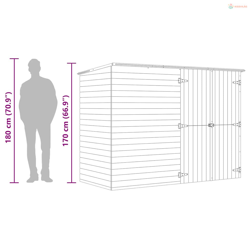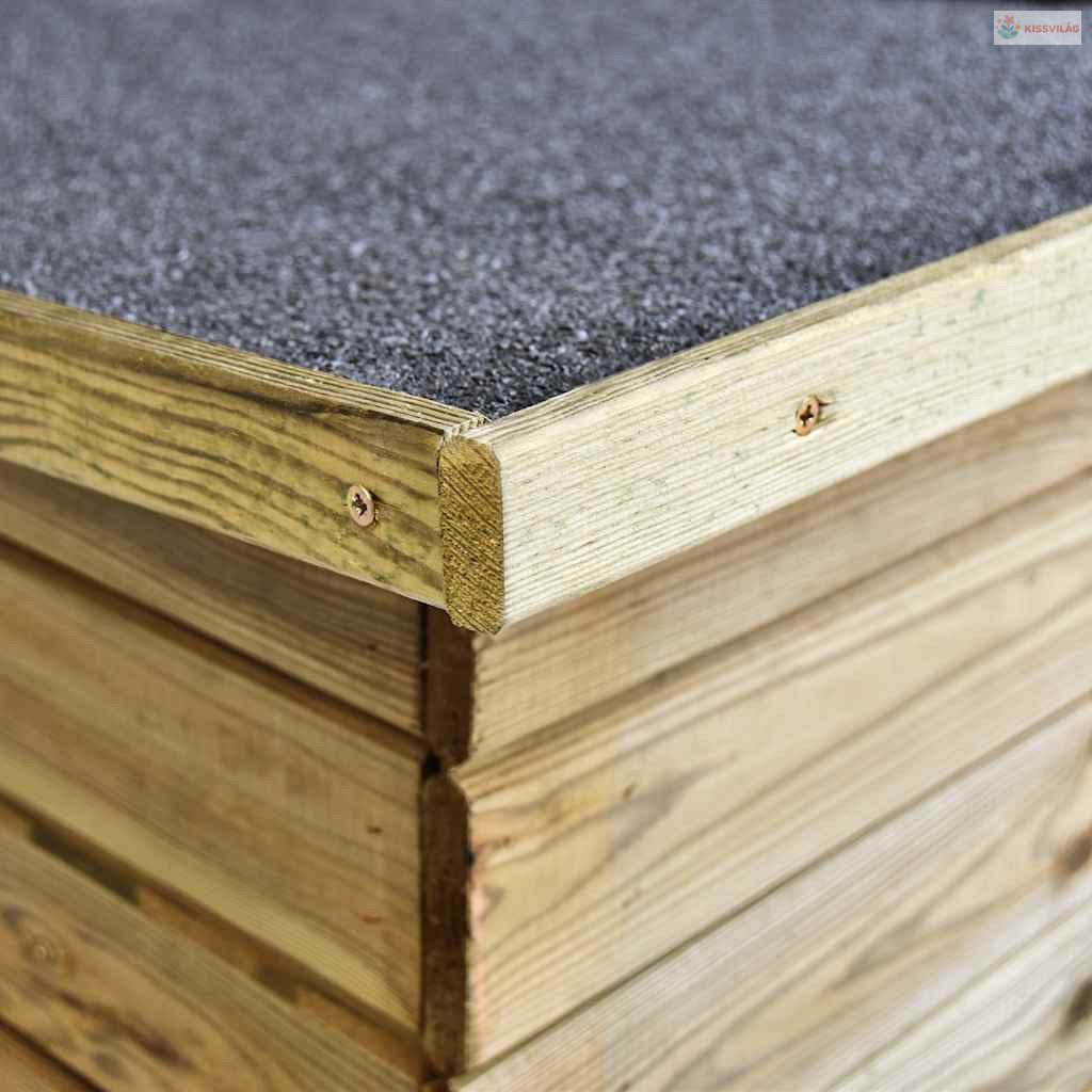 A minőségi impregnált fenyőfából készült fészer tartós és időjárásálló. A tetőt kátránypapír borítja, amely megvédi a kerti tárolót a nedvességtől. Kétszárnyú ajtaján keresztül könnyű belépni a biciklitárolóba, a zár pedig extra biztonságot nyújt.