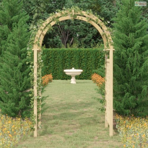 A zöld impregnált tömör fenyőfából készült kerti boltív nagyon masszív és strapabíró. A beépített rács nagyszerű támaszt nyújt rózsáknak vagy más kúszónövényeknek. Impozáns bejárat kialakítására is használható.