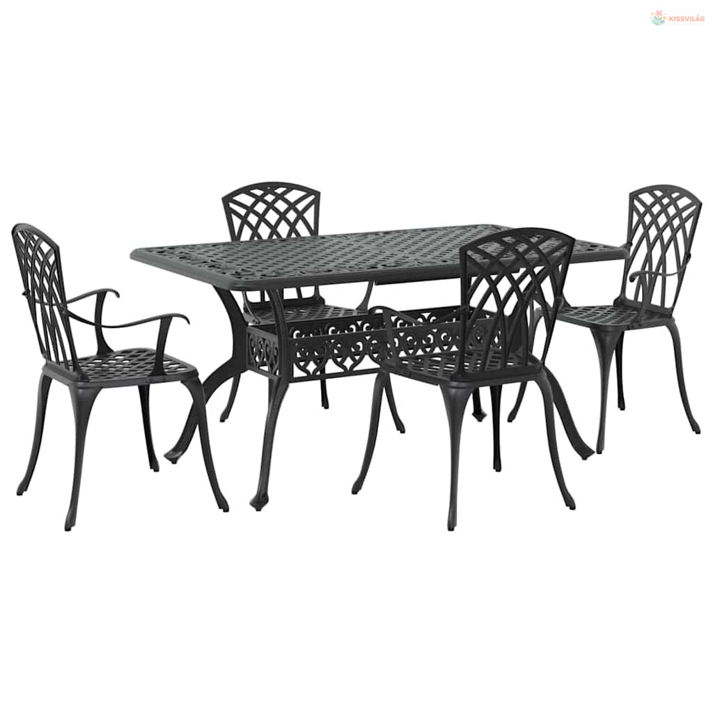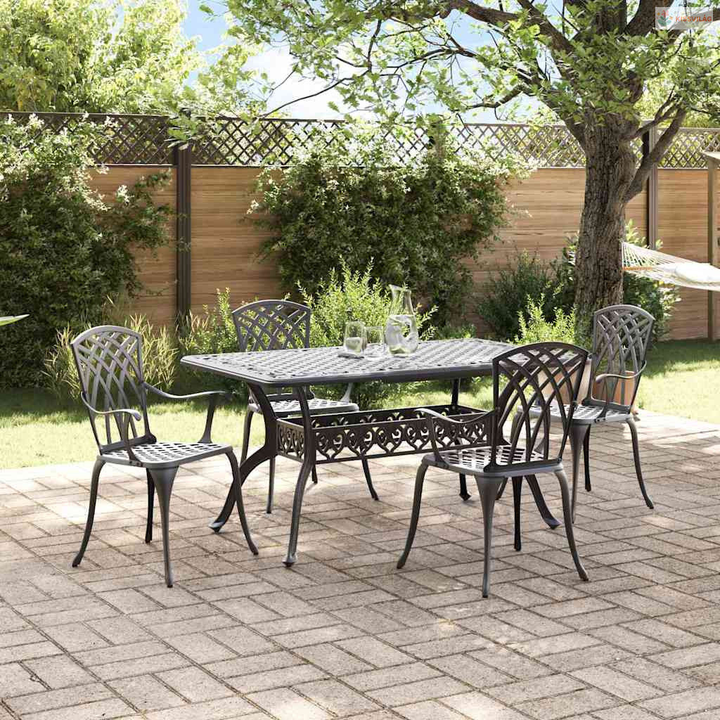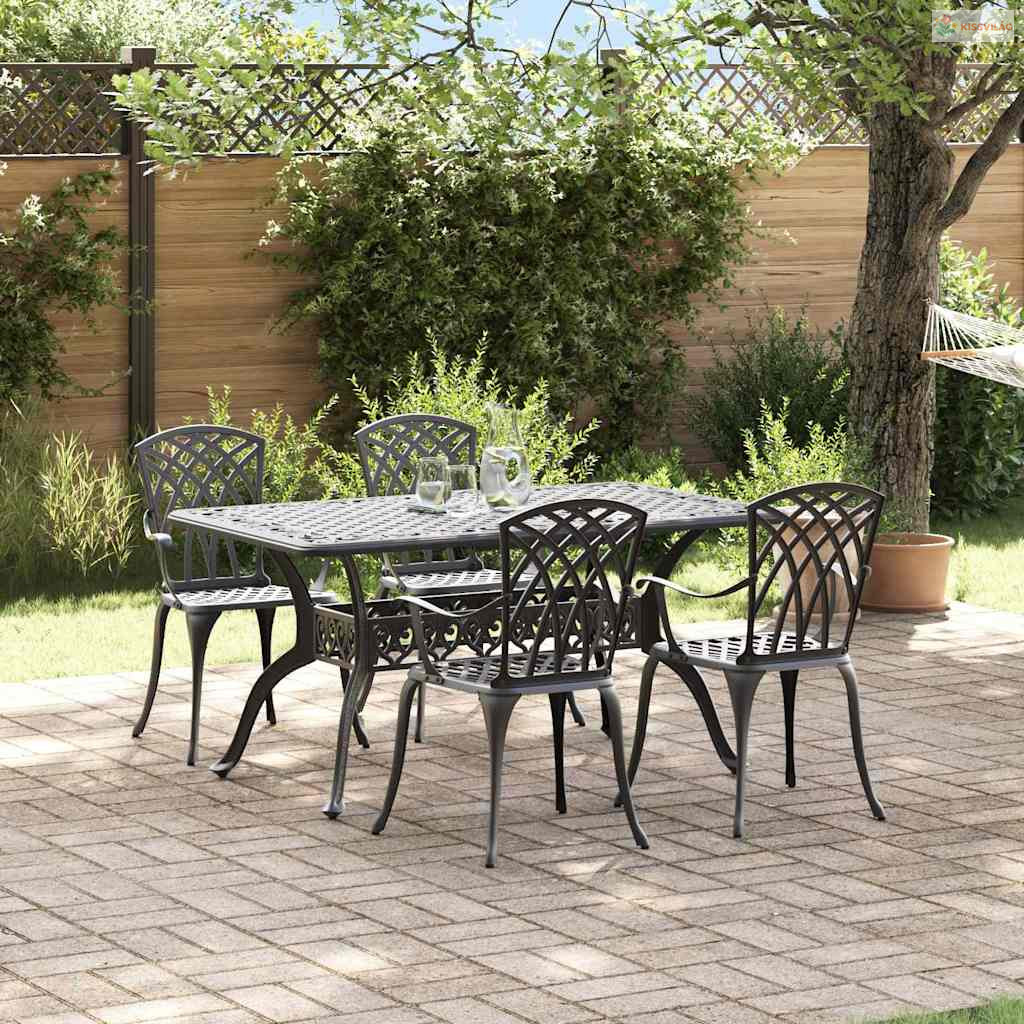 A Cast Aluminium Kerti Étkező Szett egy lenyűgöző kültéri bútor, ami ötvözi a hagyományos dizájnt a praktikus funkcionalitással. Ideális nyári és tavaszi összejövetelekhez, ez a szett úgy van megtervezve, hogy klasszikus vonzerőt adjon bármelyik kertnek vagy terasznak. A tágas, téglalap alakú asztal kényelmesen elfér akár hat főnek, így tökéletes mindennapi étkezésekhez, mind különleges alkalmakhoz.
