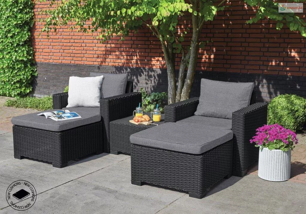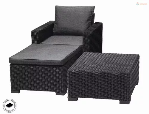 A Keter California kerti bútorkészlet kialakításában hasonlít a természetes szőtt rattanhoz, így tökéletesen kiegészíti a kert, a terasz és a háztartás klasszikus és modern berendezését. A teljes készlet 1 karosszékből, 1 kárpitos lábtartóból és 1 négyzet alakú asztalból áll. A kifinomult FLOW technológia garantálja a lehető legegyszerűbb össteszerelést, amely csak néhány rövid pillanatot vesz igénybe és valóban bárki elvégezheti.