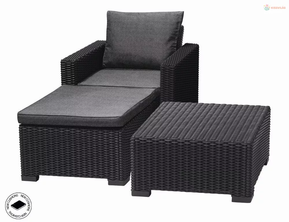• A California Keter kerti szett tartalmaz egy fotelt, egy kárpitozott lábtartót és egy négyzet alakú asztalt