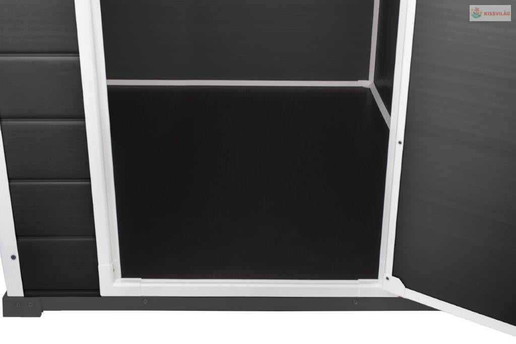 Kerti ház padlóval, a dupla falú, tartós műanyag anyag minden időjárásnak ellenáll. Szellőzés, zárható ajtó, lapos tető.