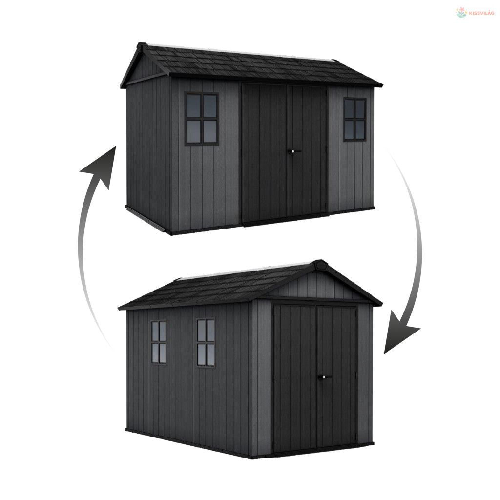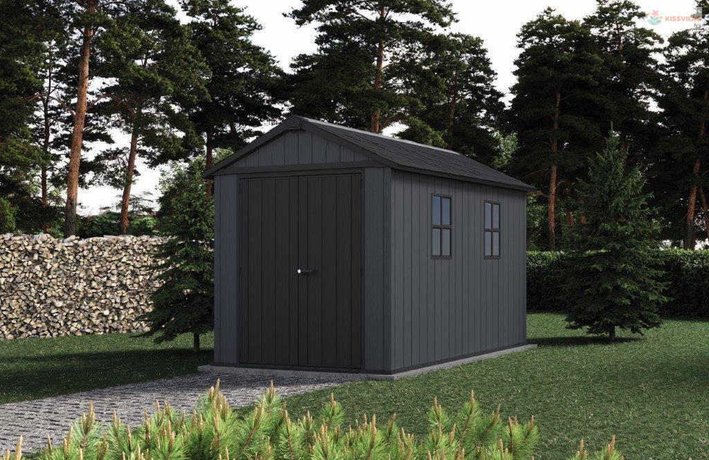 Kerti ház kerti és műhelyszerszámok és egyéb felszerelések tárolására, 2 összeszerelési lehetőség, 2,3 x 2,46 x 3,5 m, nyeregtető és padlólemez 150 kg/m2 terhelésig, dupla falak, ablakok. Evotech anyag. Sötétszürke szín.