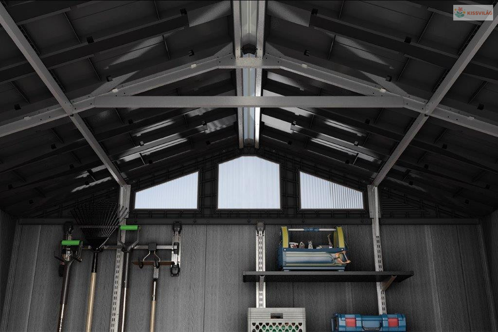 Karbantartásmentes ház kerti, műhely- és sporteszközök tárolására, szabadalmaztatott Evotech anyag és acél megerősítés. Valódi fára emlékeztető megjelenés. Szürke szín.