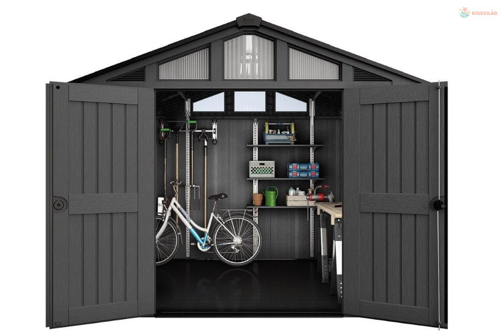 Szeretné bővíteni a tárhelyet házában? Szerelje be a polcokat a belsejébe (nem tartozék). Kisebb eszközöket, tárgyakat tárolhat rajtuk. Az ajtók extra szélesekek, így nagyobb grillsütőt vagy fűnyírót is elfér a házba.