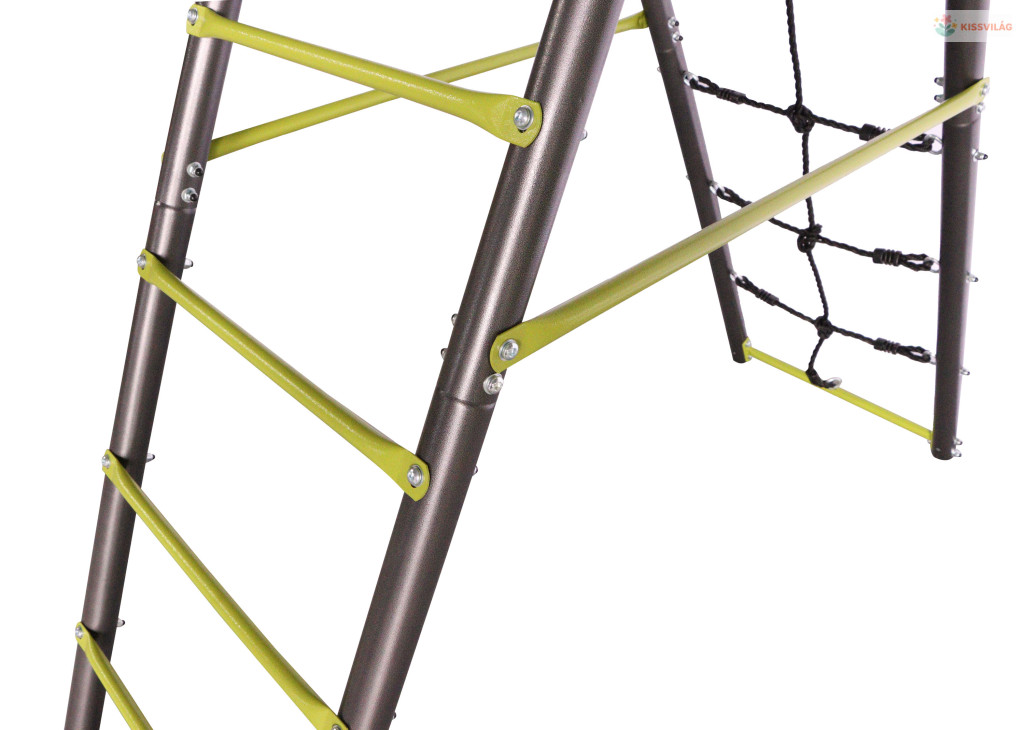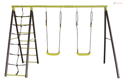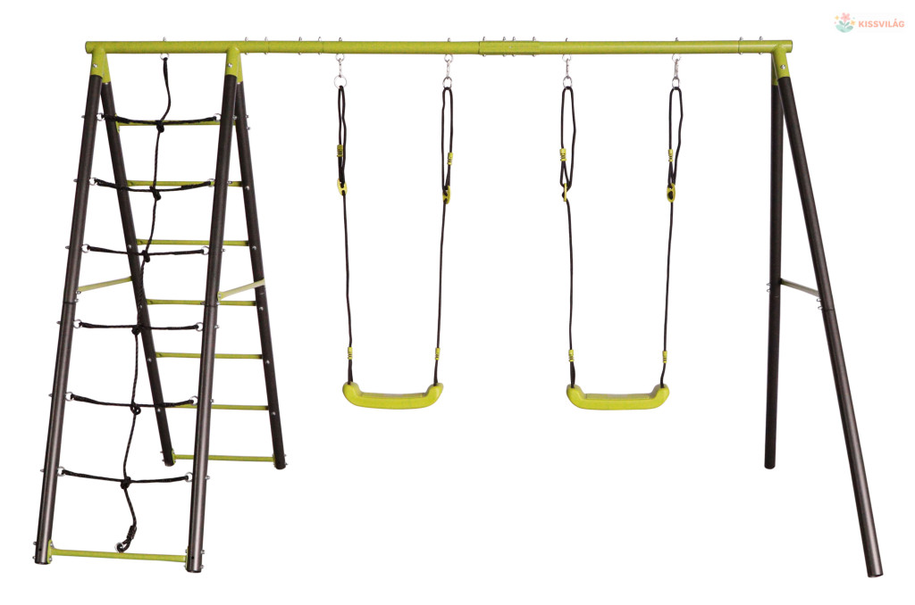 Kerti hinta gyerekeknek. Tartós és stabil fémszerkezet létrával és mászóhálóval, két hintaülés rögzített kötéllel a felakasztáshoz. Alkalmas két gyermek számára 3 és 10 év között.