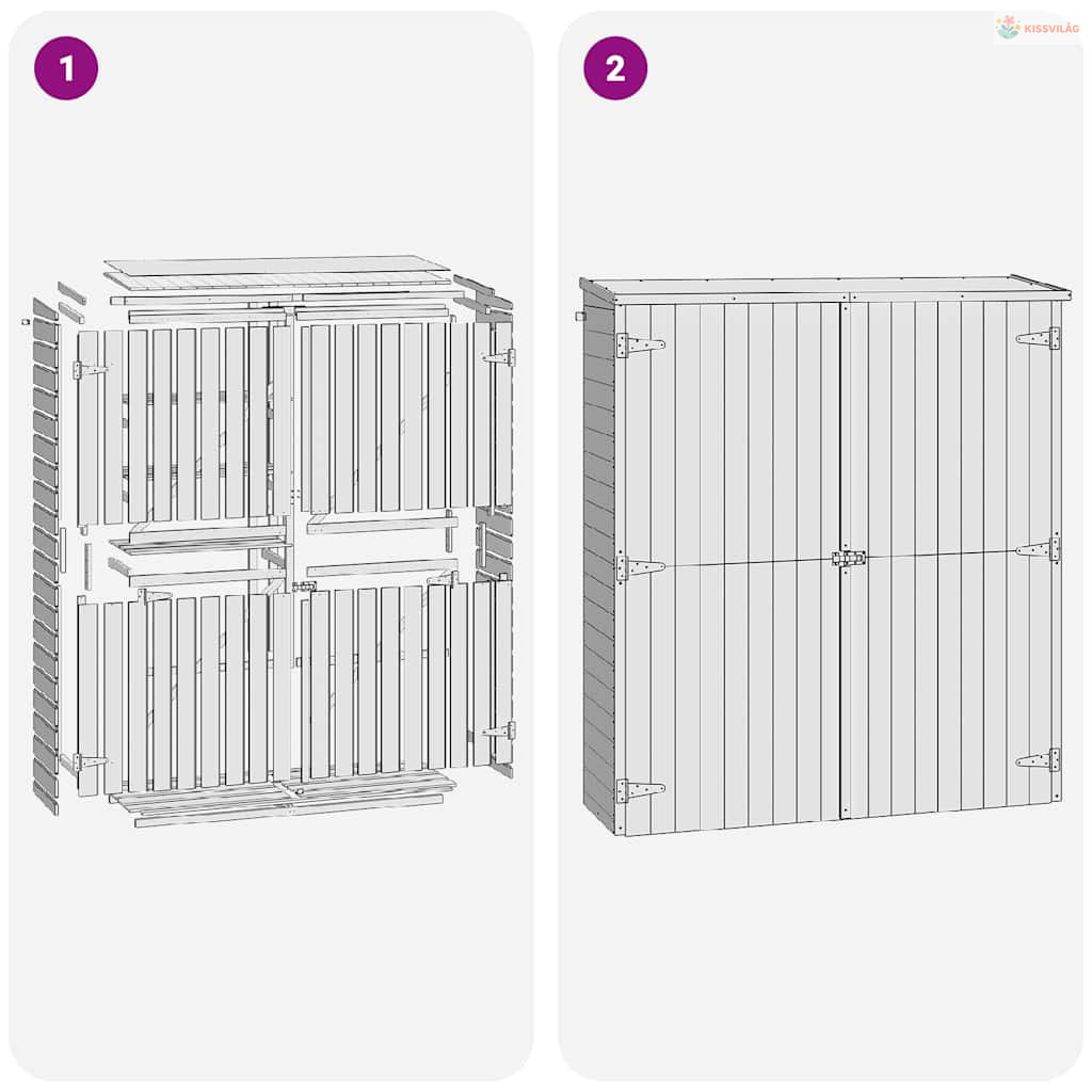 A négy jól szervezhető polccal és nagyméretű oldalsó rekesszel ellátott kamra tökéletes különböző kerti szerszámok, fűnyíró, medencekellékek, valamint hosszúkarú szerszámok, például seprű, gereblye stb. tárolására. Az impregnált fenyőfából készült tároló rendkívül tartós és időjárásálló. A tetőt aszfalt-nemez borítja, amely megvédi a kamrát a nedvességtől. Emellett a zárható kétszárnyú ajtó extra biztonságot nyújt.