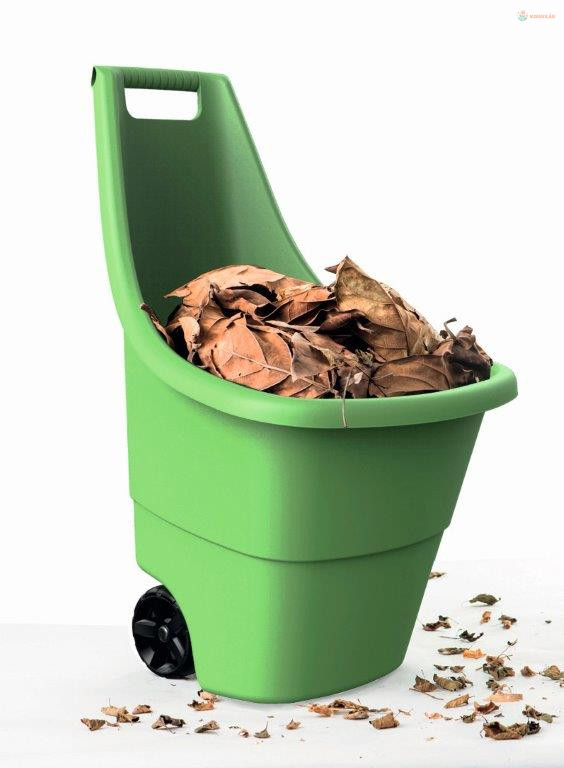 Kerti kocsi kerekeken beltéri és kültéri használatra, szilárd szerkezetű szintetikus gyantából, ellenáll az időjárásnak és az UV sugárzásnak, teherbírása 50 kg, térfogata 50 l, kis súlya 1,8 kg. Zöld színű.
