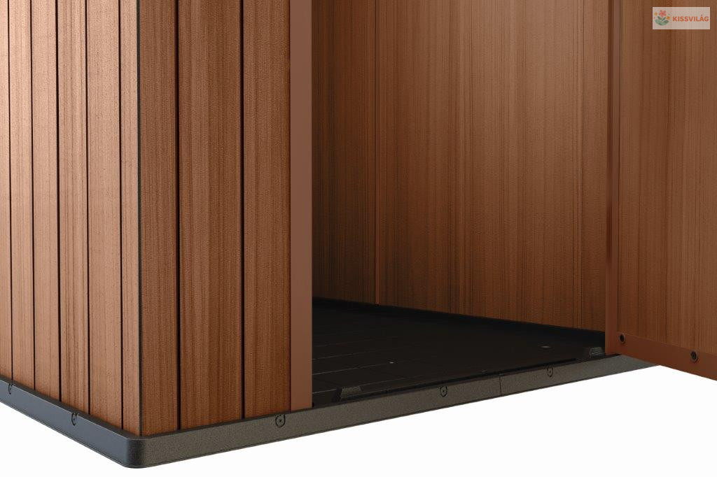 Kerti tároló kerti és műhelyi szerszámok és egyéb felszerelés tárolására, 1,26 x 2,05 x 1,84 m, a nyeregtető 75 kg/m2 teherbírással rendelkezik, a padlópanel 150 kg/m2 terhet bír el, 16mm dupla falak, szellőző rendszer. Evotech kompozit. Barna.