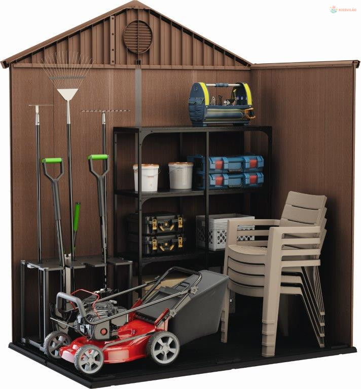 Kerti tároló kerti és műhelyi kellékek, és egyéb felszerelés tárolására, 1,90 x 2,21 x 1,21 m, nyeregtető 75 kg/m2 teherbírással, padlópanel 150 kg/m2 terhet bír el, 16 mm-es dupla falak, szellőző rendszer. Evotech kompozit. Barna.