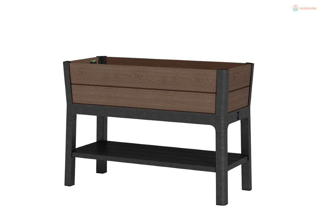 Megemelt virágláda polccal, űrtartalom 110 l, öntözés, teherbírás 110 kg, fa hatás, barna szín.