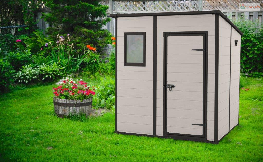 Kerti tároló kerti és műhelyi szerszámok, és egyéb felszerelés tárolására, 1,835 x 2,00 x 1,85 m, a nyeregtető 75 kg/m2 teherbírással rendelkezik, a padlópanel teherbírása 150 kg/m2, 16 mm-es dupla falak, szellőző rendszer. Evotech kompozit. Bézs