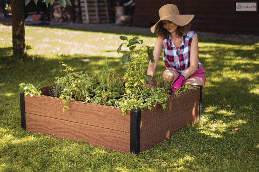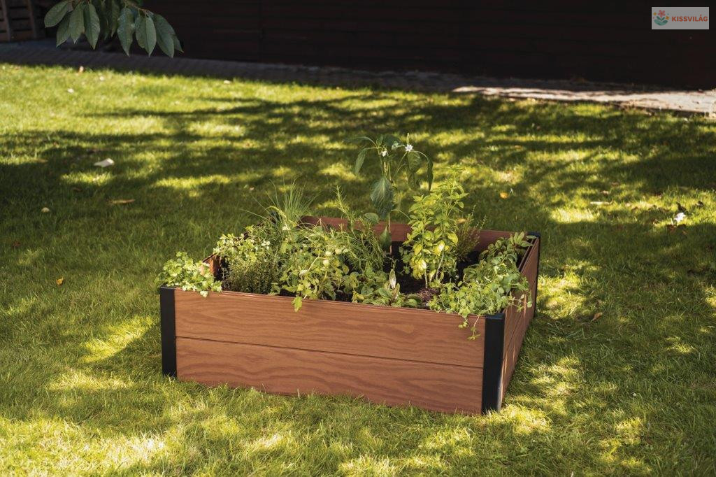 Kerti virágcserép saját zöldségfélék, gyógynövények termesztésére, védi a talaj növényzetét, kompozit anyag Evotech = nagy ellenállás, egyesíti a fa esztétikáját a műanyagok tulajdonságával, a virágok természetesen kiemelkednek benne. Barna színben.