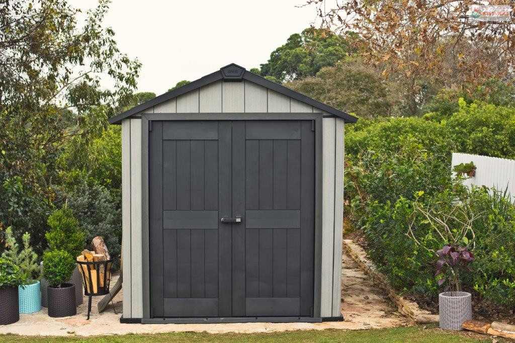 Kerti tároló kerti és műhelyi szerszámok, és egyéb felszerelés tárolására, 2,29 x 2,42 x 2,235 m, a nyeregtető 100 kg/m2 teherbírással rendelkezik. Dupla falak, dupla ablakok. Duotech kompozit, polipropilén. Szürke és antracit szín.