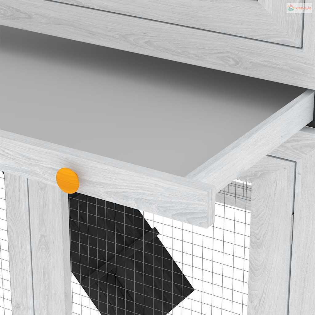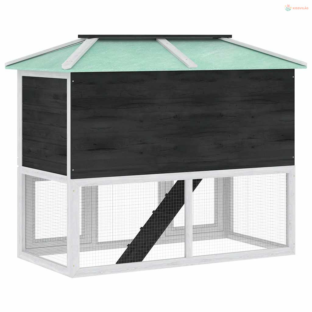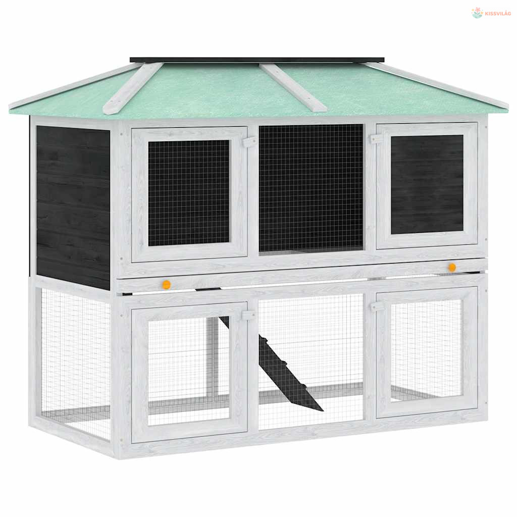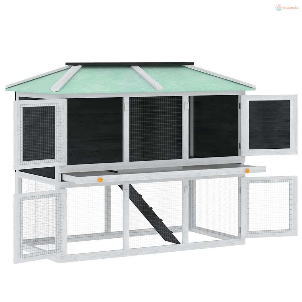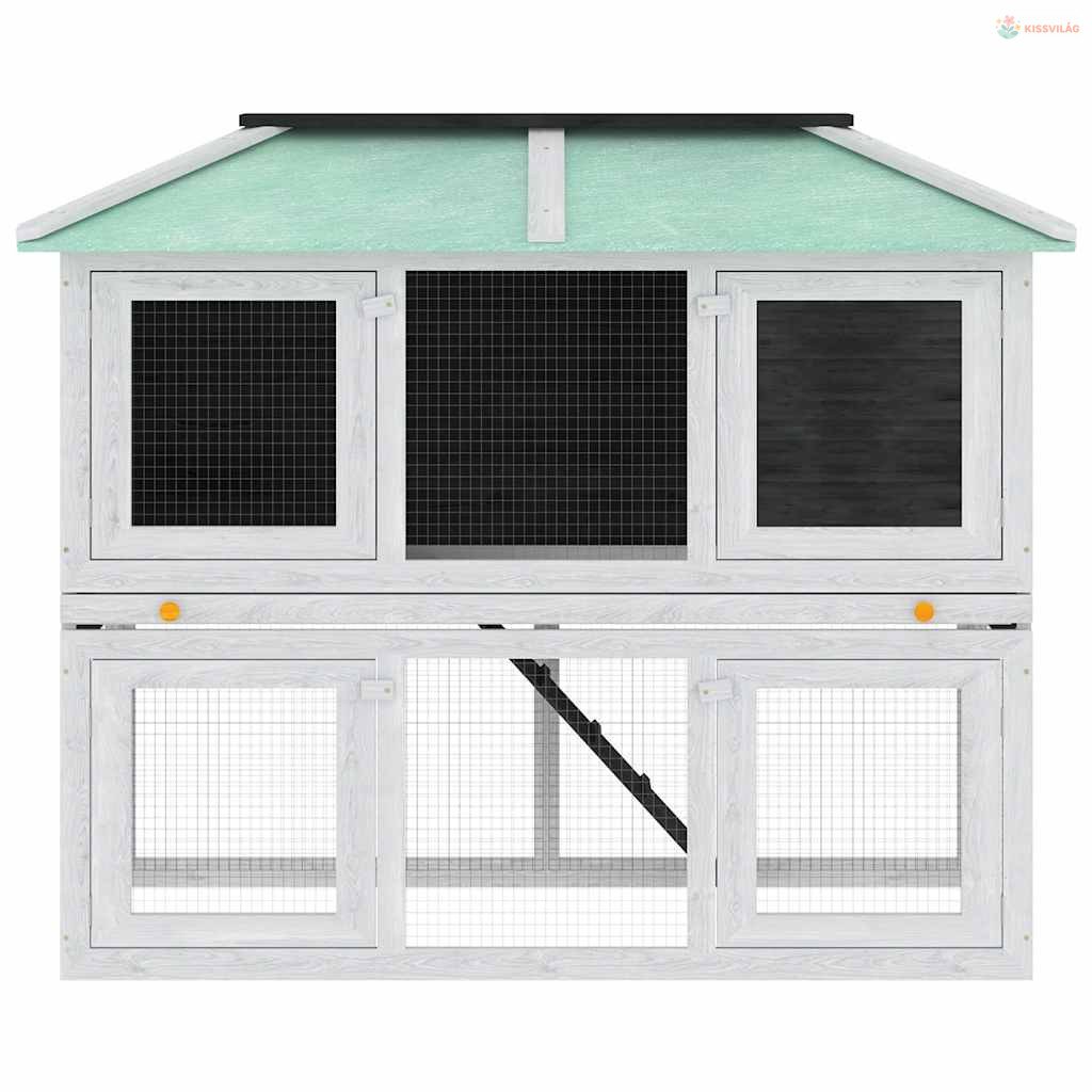Az állatketrec kiváló minőségű fakeret felhasználásával készült, ami évekig kitart. Zöld teteje távol tartja az esőt, miközben a kényelmes búvóhely tökéletes alvóhelyet biztosít. Könnyen megmászható létra vezet az alsó földszintről a felső szintre. A kihúzható tálca megkönnyíti a tisztítást. Ez a fa nyúlketrec tökéletes kisállatok tartására.