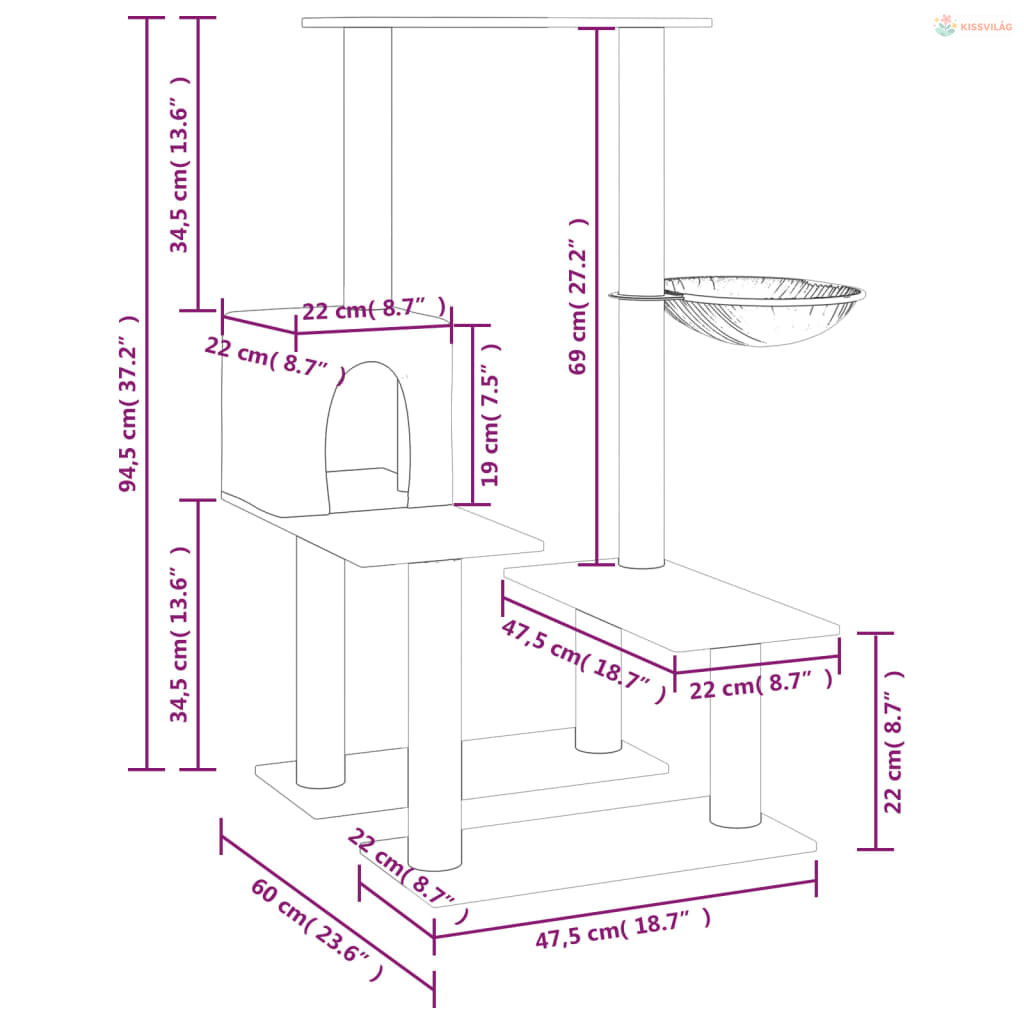 • Természetes szizáloszlopok: A kaparófa rugalmas és erős, természetes szizáloszlopai tökéletesek szeretett macskái számára, hogy kielégítsék kaparóösztönüket, és ne a bútorait karcolják meg.
