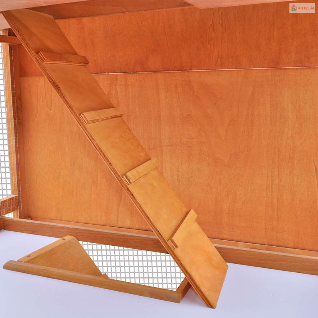 A nyúlketrec kiváló minőségű faváz felhasználásával készült, ami erőssé és biztonságosan elkerített területté teszi, ami évekig kitart. Zöld teteje védelmet nyújt az esővel szemben, míg a kényelmes búvóhely tökéletes alvóhelyet biztosít. Két könnyen megmászható rámpa vezet az alsó szintről a felső szintre. A két kihúzható tálca megkönnyíti a tisztítást. Az ajtók könnyen becsukhatók, és csúszóretesszel zárhatók.