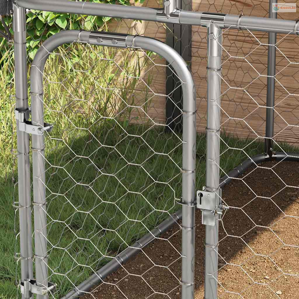 Ez a nagy kutyakennel rengeteg mozgásteret biztosít, míg a körülötte lévő háló megakadályozza, hogy a kutya elszökjön vagy baleset történjen, miközben kellő szellőzést tesz lehetővé. A nagy teherbírású, horganyzott acélszerkezetének köszönhetően a kutyakennel kiváló minőséggel bír, és hosszú éveken keresztül használható. A 100%-ban polietilénből készült tető UV- és tűzálló, valamint védelmet nyújt a nap, eső, hó és zord időjárás ellen. A zsanéros, zárható reteszrendszerrel ellátott ajtó extra biztonságot nyújt kutyái számára.
