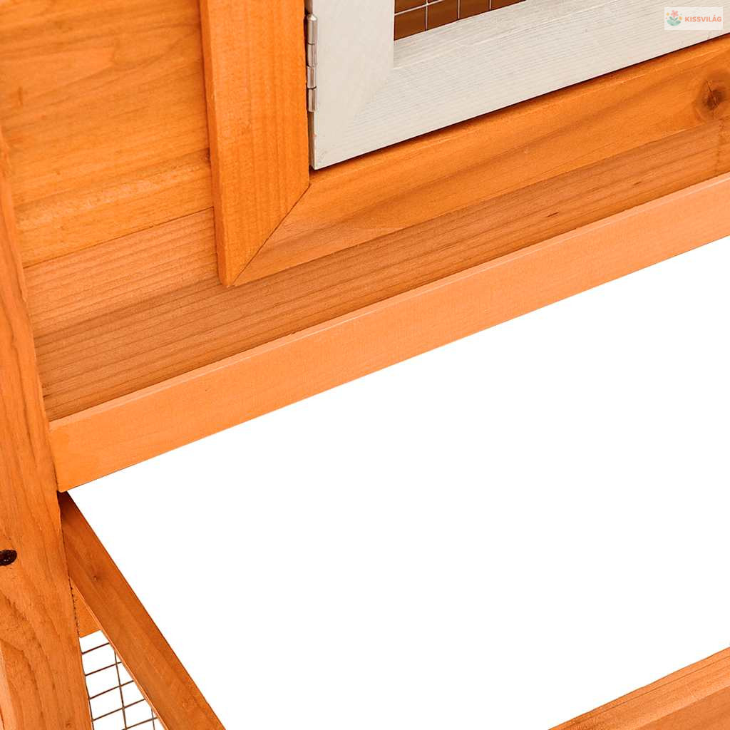 A nyúlketrec kiváló minőségű fenyővázzal rendelkezik, így garantáltan sokáig használható. A kényelmes alvórész tökéletes pihenőhelyet biztosít háziállatai számára. A felső emeletre két könnyen megmászható létra vezet.