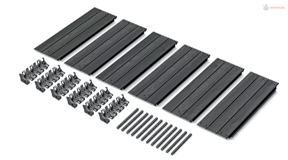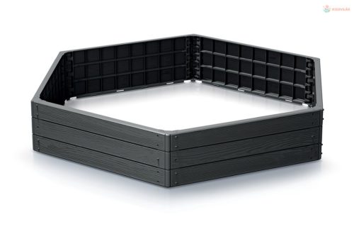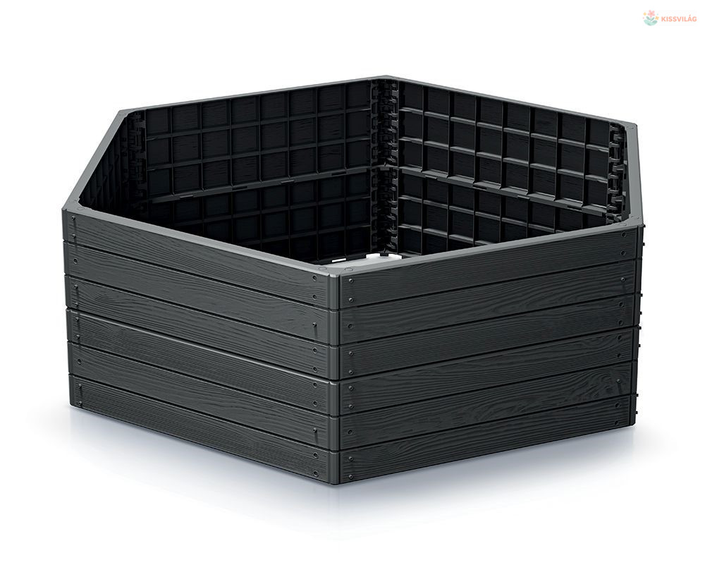Magaságyás antracit színben, műanyagból, fa textúrával, egymásra rakható ágyások, nincs alja, kevesebb a gyom, kényelmesebb a növényápolás, dekoratív elemként is használható a kertben.