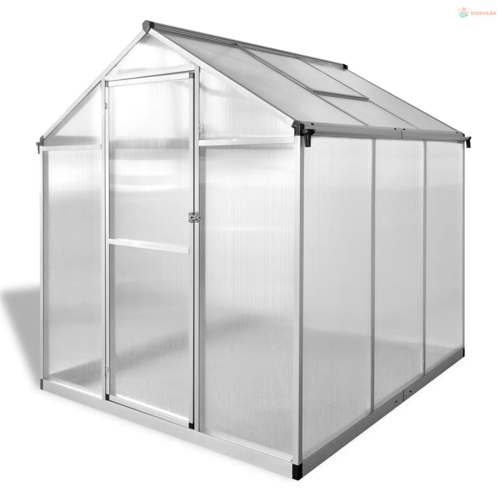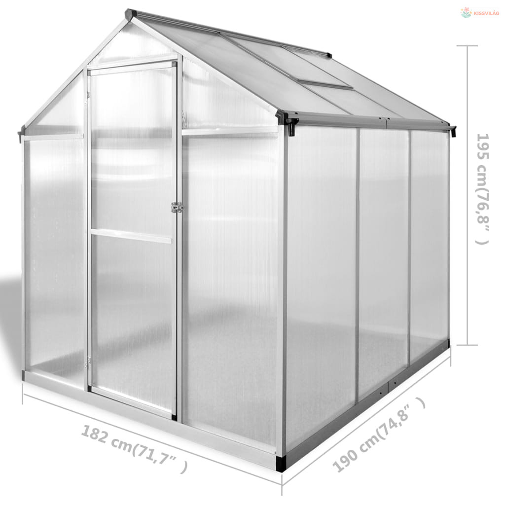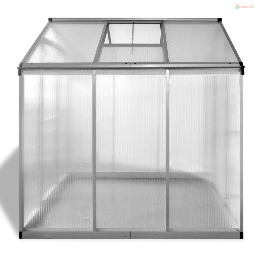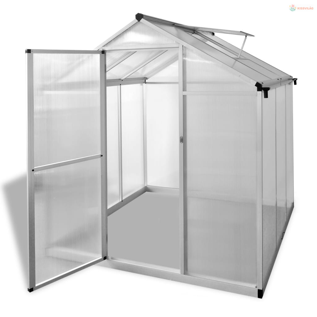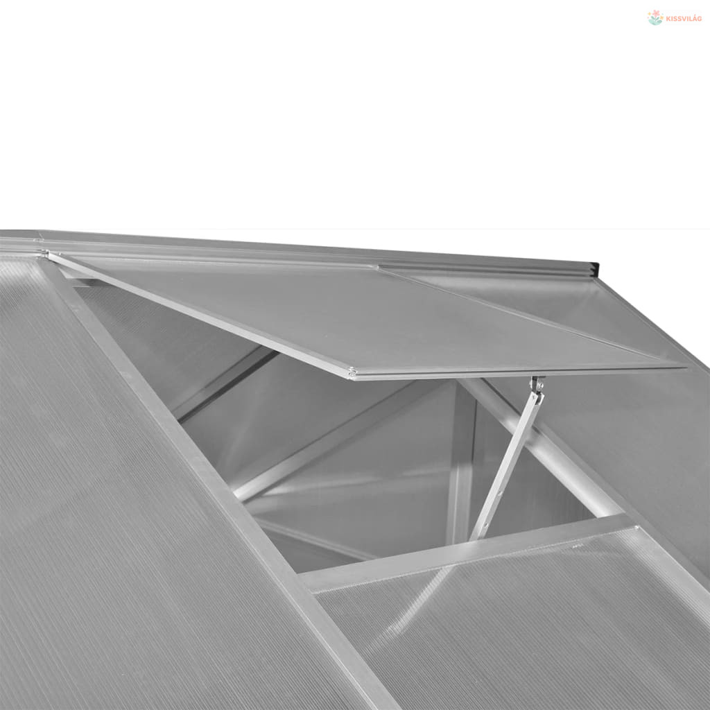 A melegház robusztus és karbantartást nem igénylő alumínium szerkezettel rendelkezik a nagyobb stabilitás érdekében. A hornyolt rendszer hatékonyan vezeti el a vizet, a tetőszellőző pedig optimális szellőzést biztosít a forró napokon.