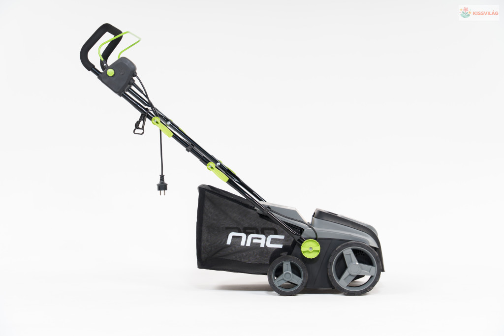 Levegőztető/vertikülátor, 1800 W-os villanymotor. Ergonomikus állítható fogantyúk. 16 penge a tengelyen a karcoláshoz, levegőztető tengely tartós rugókkal. Gyep karbantartására alkalmas. Állítható munkamélység 9 és -13 mm között.