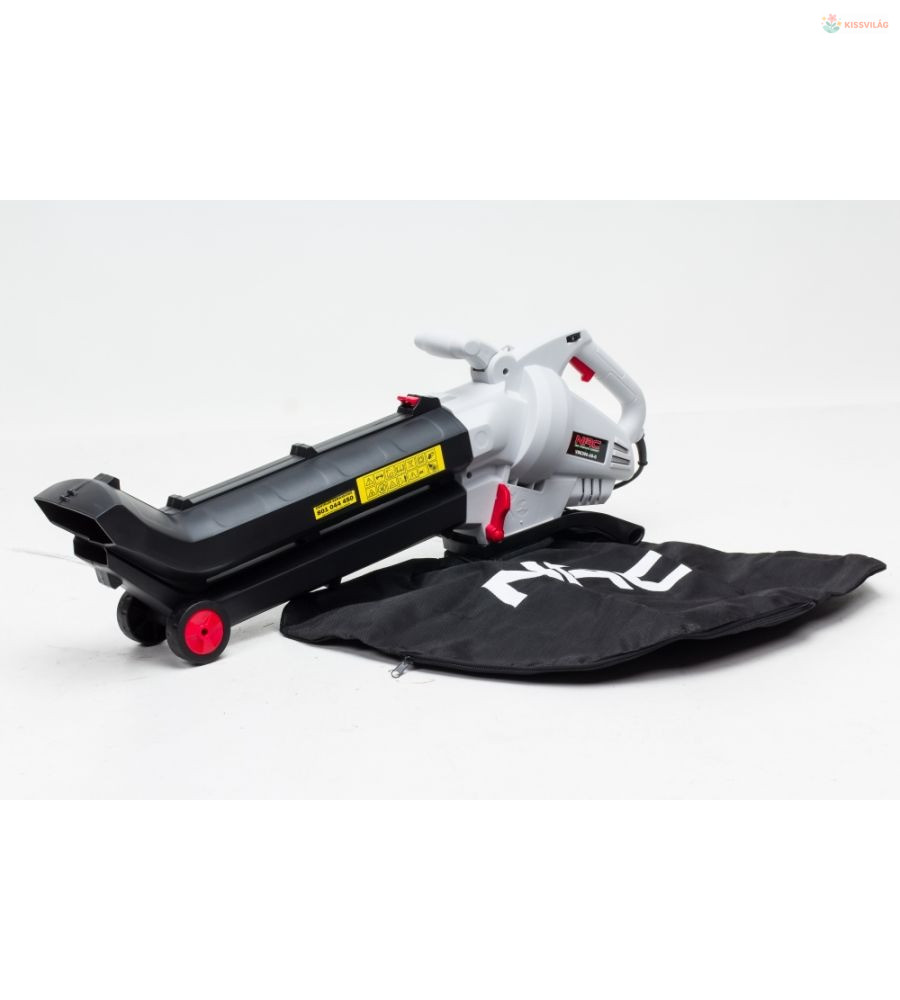 Elektromos levélporszívó, 10:1 porszívó, fújó és aprító funkciókkal. 45l-es levélzsák cipzárral, ergonomikus fogantyú és heveder a kényelmes munkavégzéshez. Kerekek a talajon való mozgáshoz. Állítható szívó- és fúvóerő. Összecsukható.