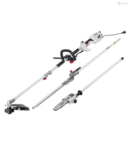 Multifunkcionális elektromos bozótvágó 3 az 1-ben, teljesítmény 900 W. Tartozék bozótvágóhoz, láncfűrészhez és sövénynyíróhoz. Heveder a kényelmes hordozáshoz. Hatótávolság akár 180 cm-ig. Állítható szög a sövénynyíróhoz. Összecsukható hajtórúd.
