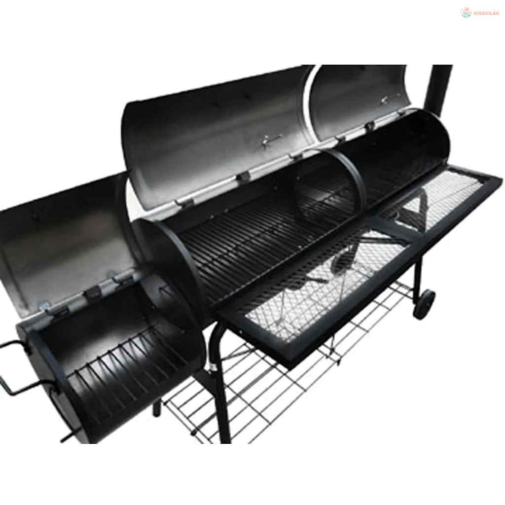 Ez a füstölő két, rendkívül tágas grillezővel lett ellátva. A hőmérő segítségével mindig nyomon követhetjük a füstölőben uralkodó hőmérsékletet. A sütő alján található kiegészítő polcon plusz fát tárolhatunk.