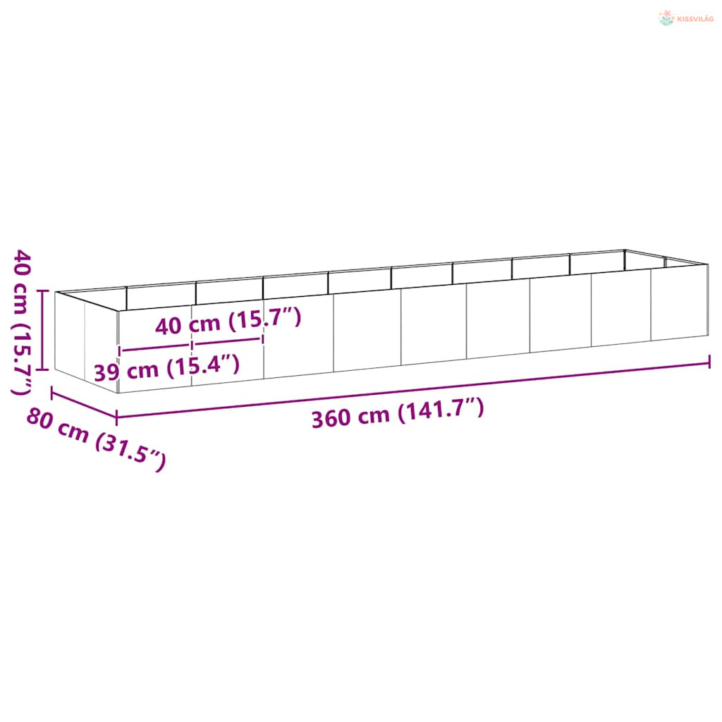 • Teljes méretek: 360 x 80 x 40 cm (Sz x M x H)
