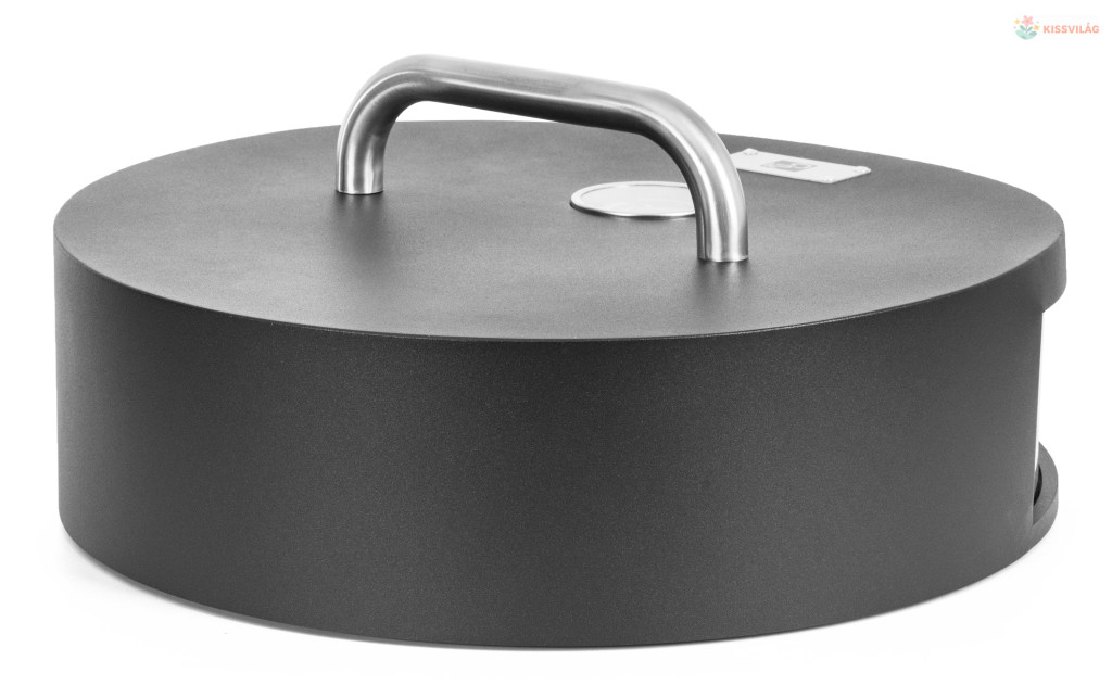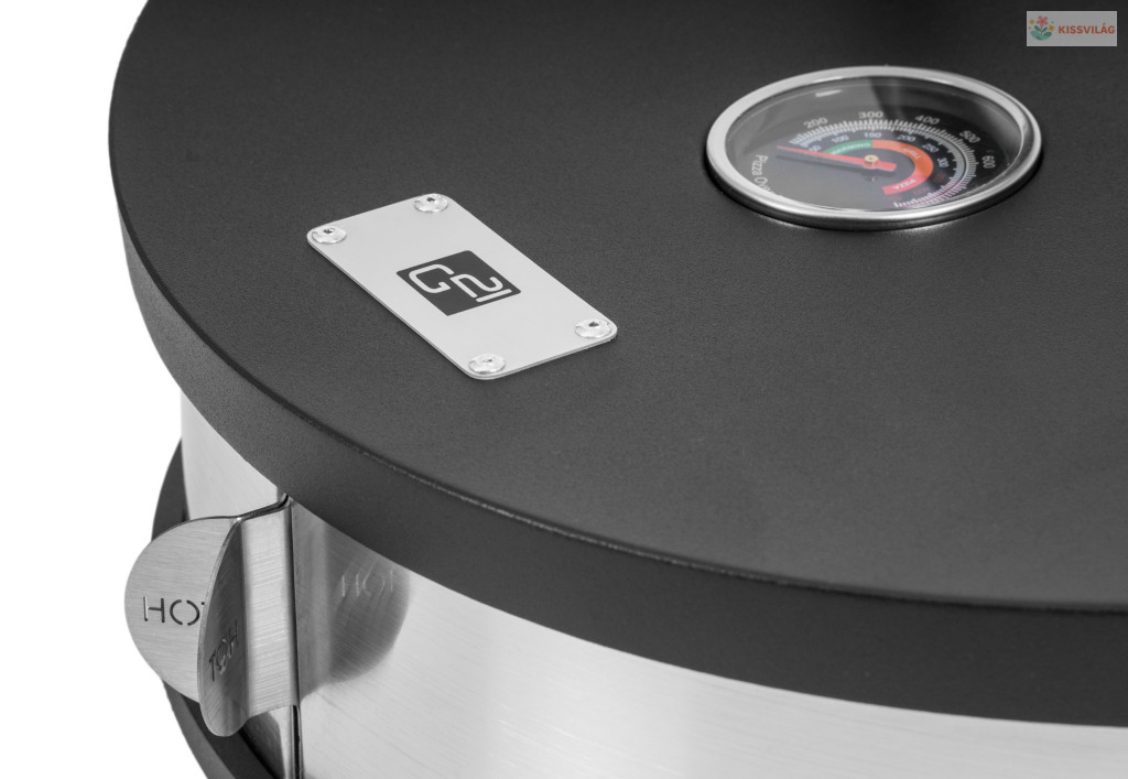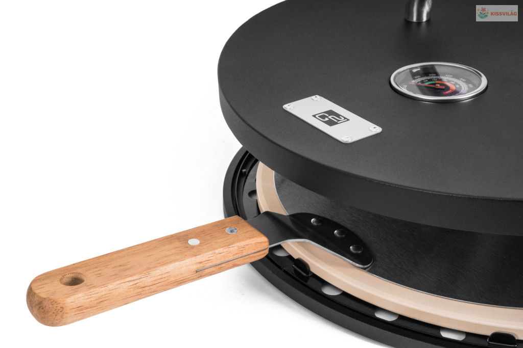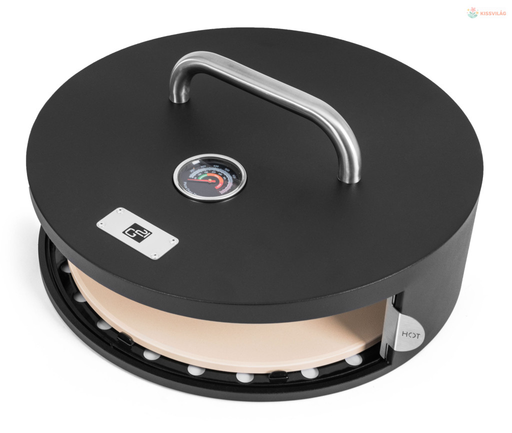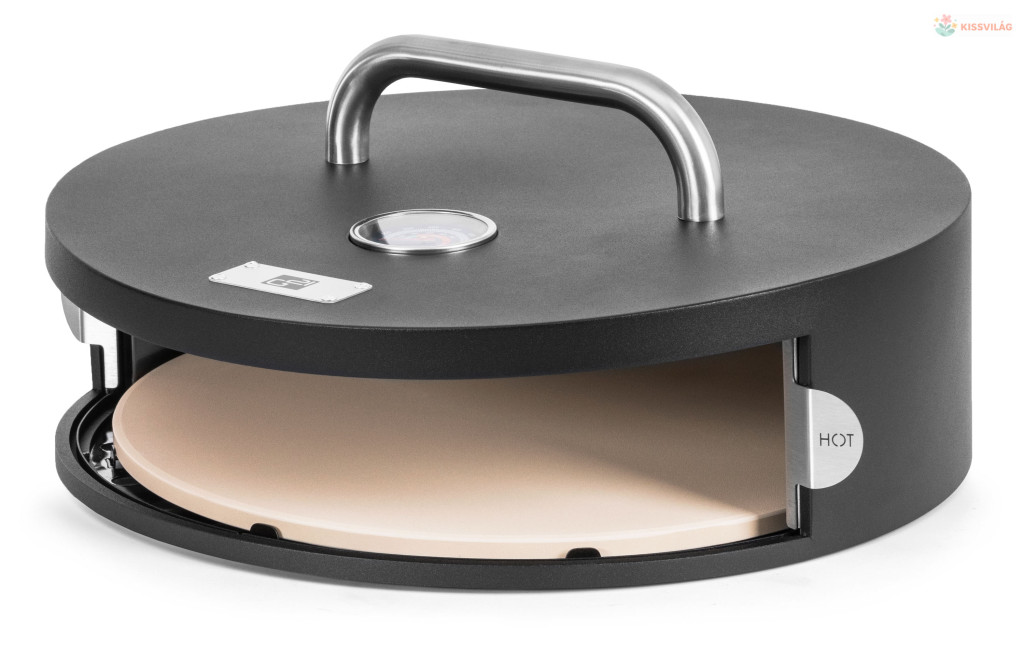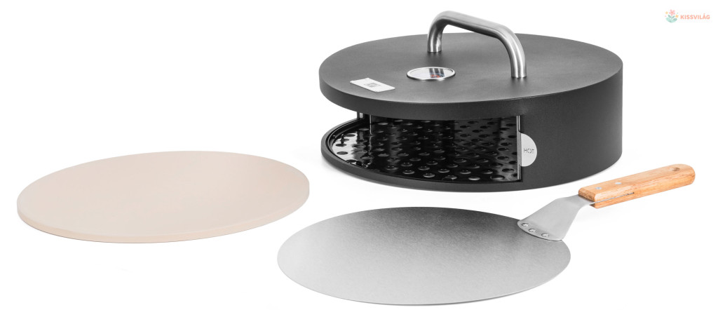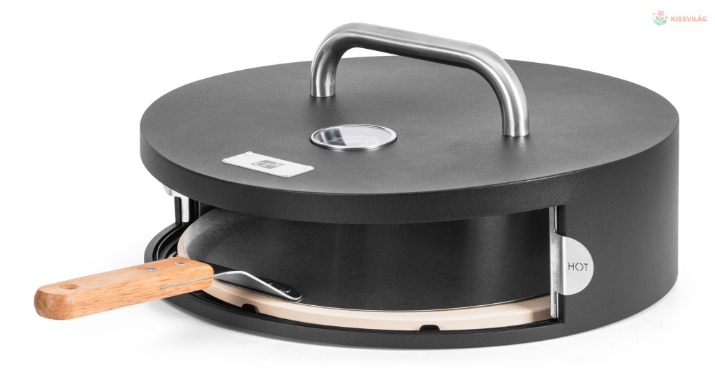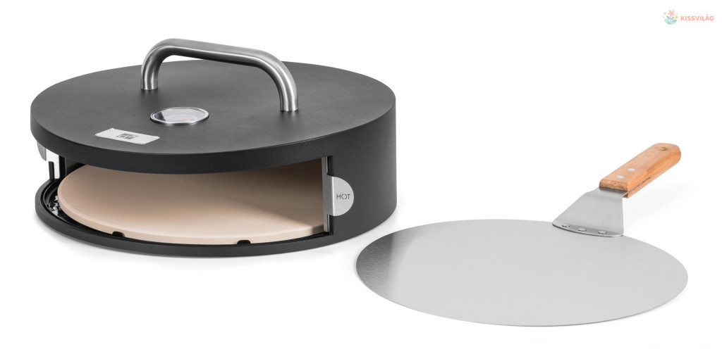 Pizzasütő kerti grillekhez, akár 30 cm átmérőjű pizzákat is készít, kiváló minőségű lemezből és rozsdamentes acél betétből készült kialakítás, kordierit kő, pizzasütő spatula, hőmérő a fedélben.