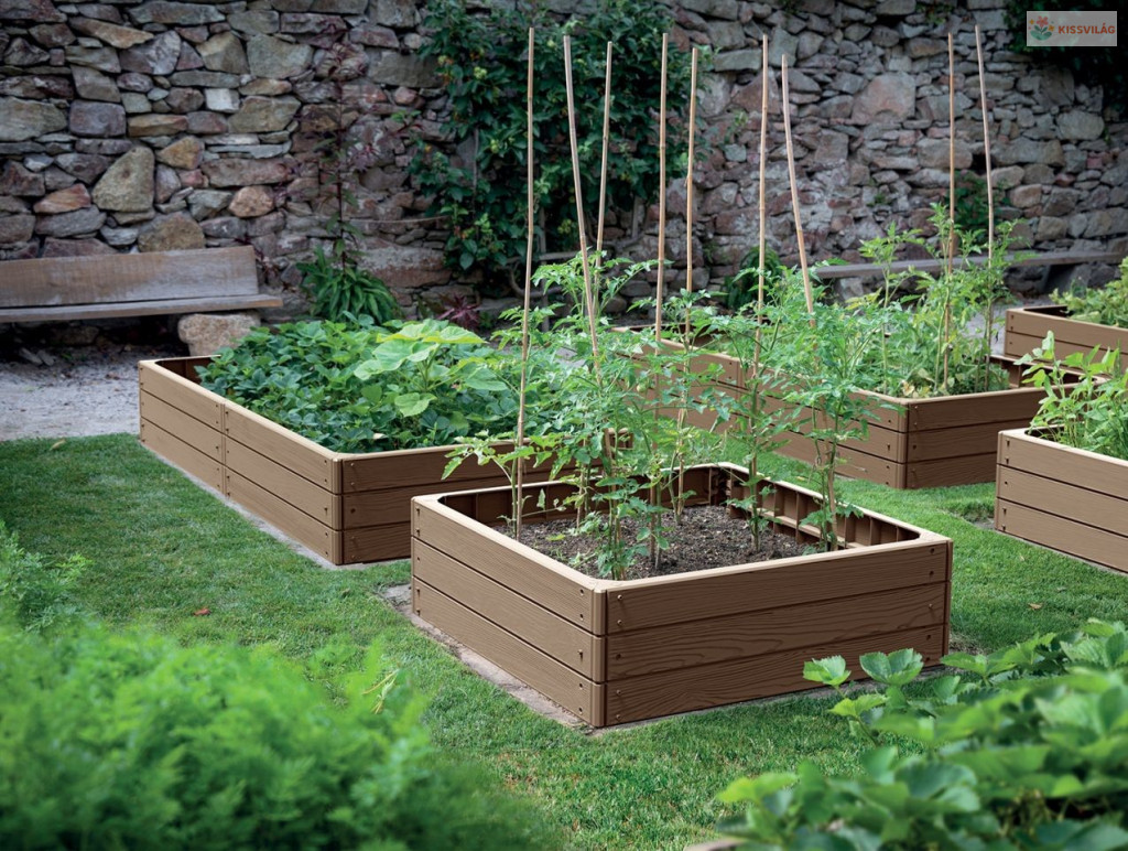 Magaságyas barna színben, műanyagból készült, famintázatú, egymásra rakható ágyások, nincs alja, kevesebb gyom, kényelmesebb a növényápolás, dekoratív elemként is használható a kertben.