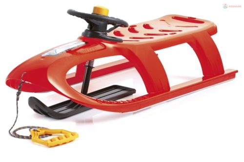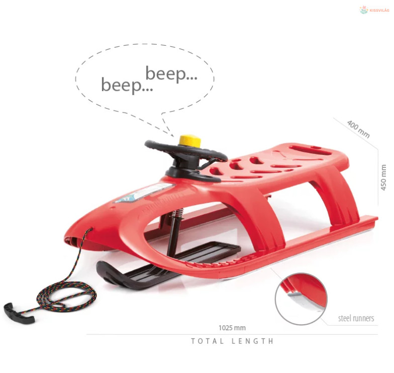 Műanyag szánkó, 2 gyermeknek, teherbírás 50 kg-ig, acél talpak, kormánykerék dudával, -18 °C-ig hőmérsékletálló, kötél a könnyű kezelhetőségért. Anyaga műanyag és fém, színe piros.