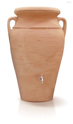 300 l, terrakotta, amfora dizájn, 2 leeresztőnyílás, 120 cm magasság, műanyag, csap nélkül.