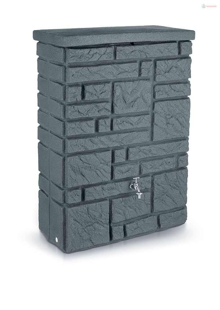 300 literes esővízhordó. Valódi kőfal kialakítás. Csap vagy kerti tömlőcsatlakozó hozzáadásának lehetősége. Fenti nyílás fedéllel. Méretek (szé x ma x mé): 40 x 118 x 80 cm.