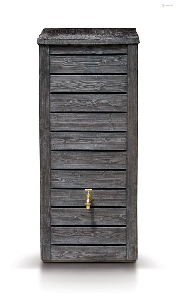 Esővízhordó, 230 l térfogatú, csapcsatlakozással, időjárásálló, természetes fára emlékeztető kialakítással.