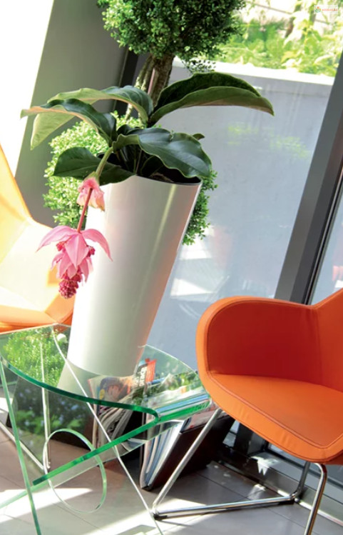 Magas virágcserép, térfogata 15,5 l, fehér fényes. Kiváló minőségű műanyag betét, alkalmas beltéri és kültéri használatra.